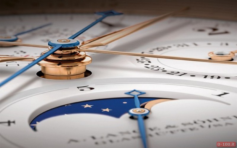 A. Lange & Söhne Grand Complication, realizzato in un‘edizione limitata di soli 6 esemplari, monta il calibro L1902 di manifattura, meccanico a carica manuale: 67 rubini, 18.000 alternanze l’ora, 7 castoni d’oro avvitati, scappamento ad ancora di Glashütte, ancora e ruota dell’ancora in oro di 18kt, bilanciere con viti con sistema antiurto, regolazione micrometrica della racchetta con vite di regolazione laterale e molla a collo di cigno, indicazione di ore, minuti e piccoli secondi; suoneria con grande (42 ore) e piccolo rintocco (30 ore); ripetizione minuti, cronografo monopulsante rattrapante con contatore di minuti e lancetta dei secondi “foudroyante”, calendario perpetuo con data, giorno della settimana, mese in ciclo quadriennale, fase lunare e 30 ore di riserva di carica.