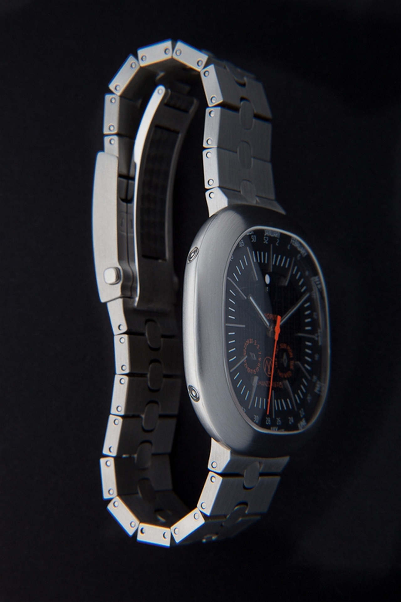 Ogni esemplare, viene fornito con due cinturini: un bracciale di metallo e un cinturino in alligatore arancione con cuciture nere a contrasto. Entrambi hanno una regolazione brevettata in modo da poter regolare il bracciale/cinturino esattamente alle dimensioni del polso.