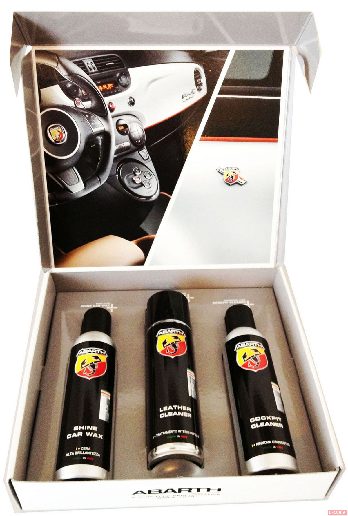 Dalla collaborazione fra Abarth e Green Star nasce un kit di 3 prodotti dedicato al “car care” costituito da: Shine Car Wax, Leather Cleaner e Cockpit Cleaner.