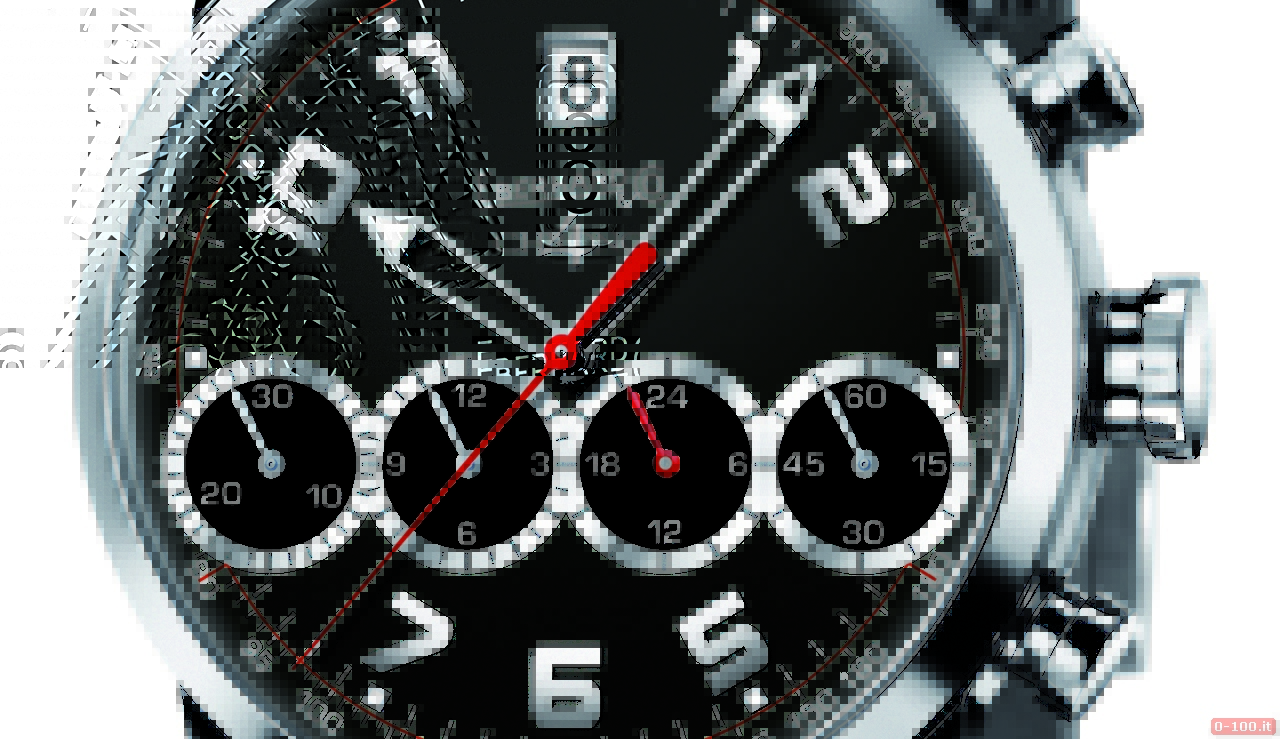 Sul quadrante, di colore nero e protetto da vetro zaffiro bombato antiriflesso, dà bella mostra di sé il dispositivo di allineamento dei 4 contatori (di colore nero con bordo argenté e finitura azzurrata) brevettato da Eberhard & Co: 30 minuti, 12 ore, 24 ore e secondi continui (guardando da sinistra verso destra).