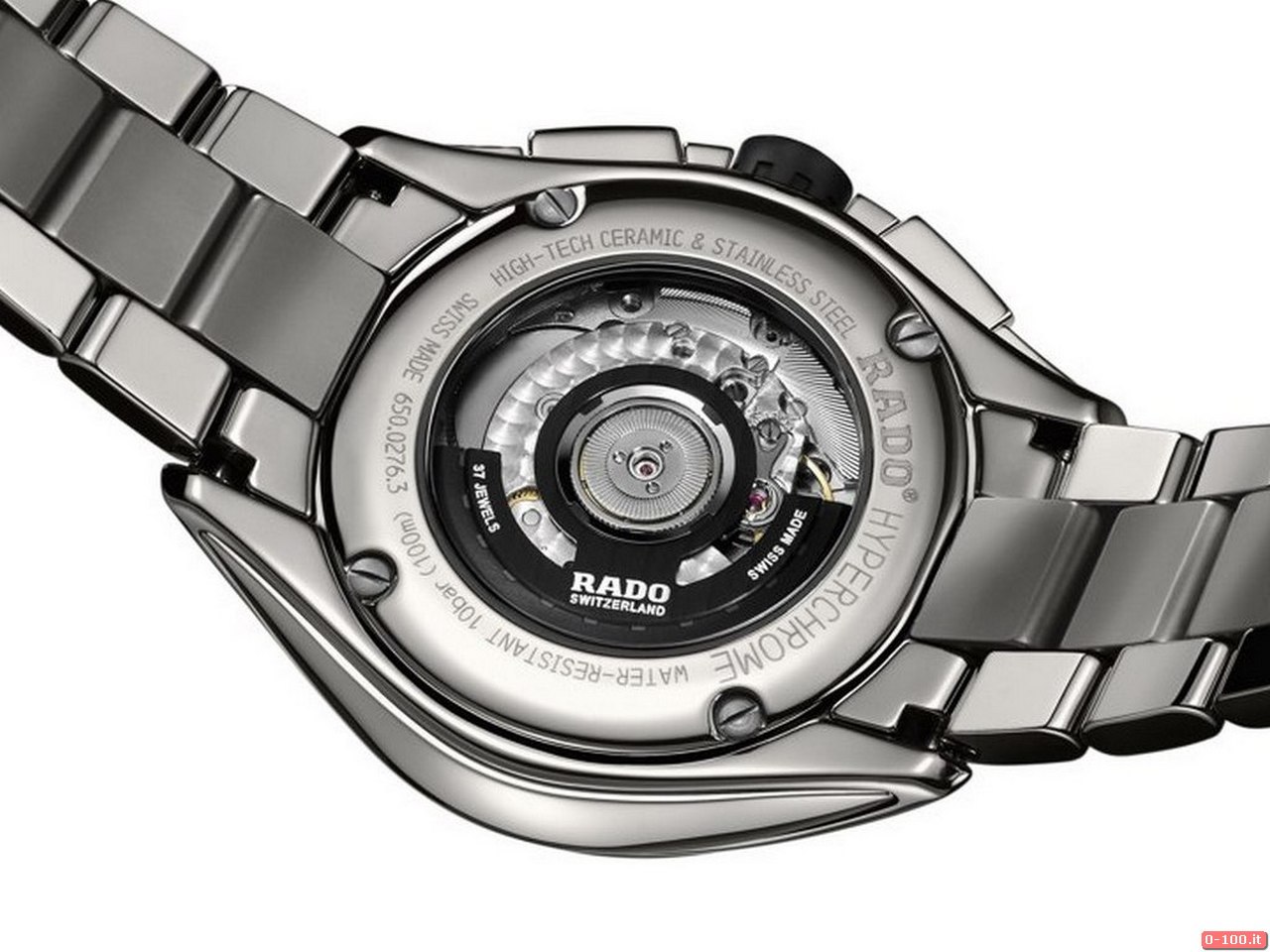E’ equipaggiato con il calibro ETA 2894-2 personalizzato da Rado, un movimento meccanico a carica automatica con funzione di cronografo e massa oscillante di colore nero.