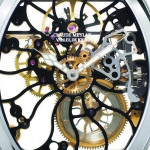 Al suo interno batte il calibro 165 CM14, un movimento meccanico a carica manuale scheletrato che pare quasi galleggiare tra due vetri zaffiro (lato quadrante e lato fondello).