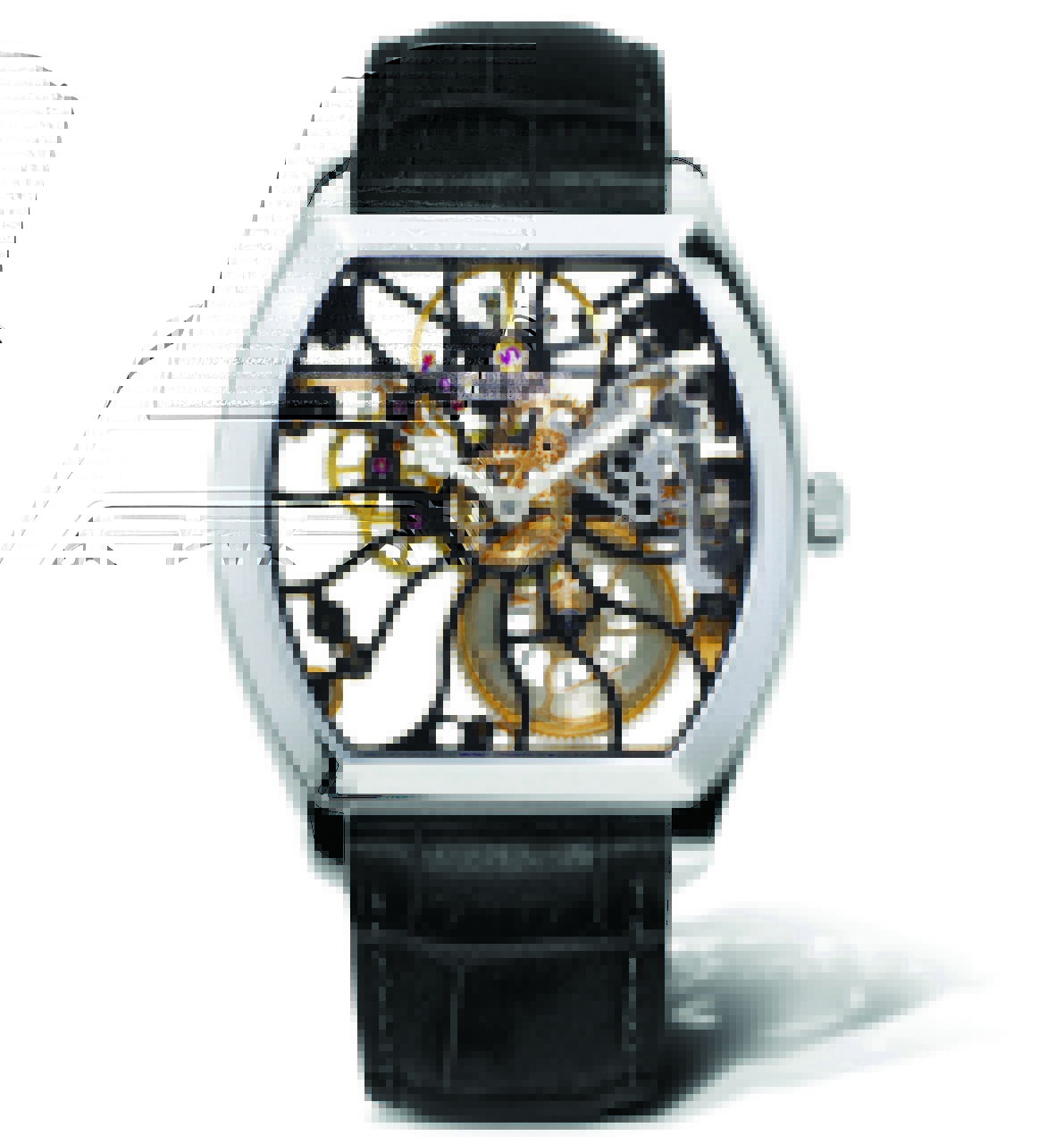 Le decorazioni sul display, realizzate da mani sapienti, riprendono le bandiere che decorano le persiane delle antiche fattorie orologiere. Le lancette sono scheletrate e rodiate.
