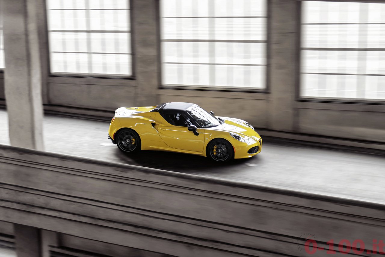 SEMBRA PIU’ UNA DINO! DOPO LE FOTO DI BACKSTAGE PUBBLICATE RECENTEMENTE, ALFA ROMEO SVELA LA 4C SPIDER, IN ANTEPRIMA MONDIALE AL NAIAS 2015. PESA SOLO 10 KG IN PIU’ RISPETTO ALLA COUPE’ E SFOGGIA ROLLBAR IN ALLUMINIO E TETTO RIMOVIBILE (SI POTRA’ AVERE ANCHE IN CARBONIO). PICCOLI RITOCCHI ESTETICI DANNO UN PIZZICO DI PERSONALITA’ IN PIU’. MECCANICAMENTE NON CAMBIA NULLA (4 CILINDRI 1750 CC, 240 CV, 0-60 MIGLIA IN 4,1 sec., 258 KM/H). DISPONIBILE NEGLI SHOWROOM AMERICANI IN ESTATE ANCHE CON IL NUOVO COLORE GIALLO.