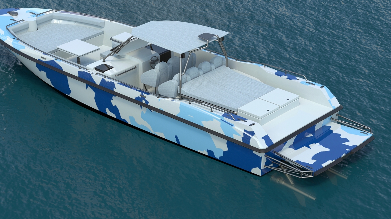 Questo virile day-cruiser, con lo scafo color blu-grigio camouflage, riprende il concetto di “barca militare” anche nei particolari come saldature visibili a sottolinearne l’essenzialità mentre l’hard-top in acciaio inox sabbiato gli conferisce un aspetto ben rifinito e tecnologico.