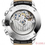 Sul bianco quadrante spiccano a ore 12 la doppia finestrella del datario, l’indicazione delle fasi lunari al 6, delle 24 ore al 9 e i contatori del cronografo rispettivamente dei 30 minuti crono alle 12 e delle 12 ore alle 6 con lancetta centrale azzurrata dei secondi cronografici.