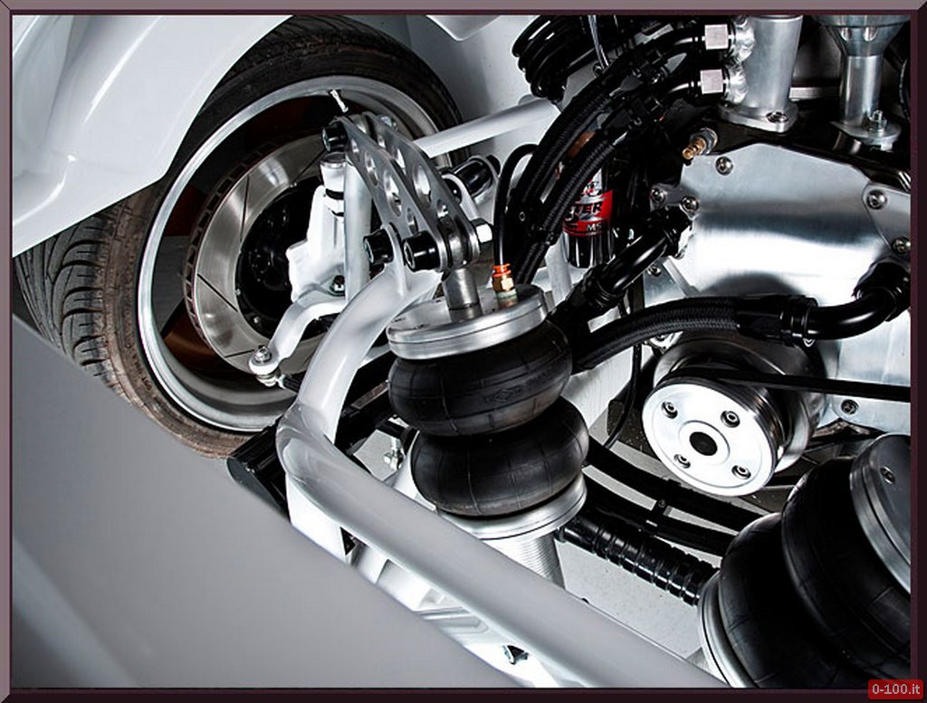 Il proprietario che ha deciso di venderla ha fatto praticamente tutto artigianalmente. Telaio a traliccio tubolare realizzato a mano. Le sospensioni presentano un’architettura simile alle vetture di Formula 1 e sono integrate con ammortizzatori ad aria.