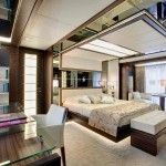 Gli ambienti della barca, tutti illuminati con plafoni e proiettori led, sono giocati sui toni chiaro-scuro dei rivestimenti e materiali; legni di ebano e rovere si combinano a pelli pregiate, elementi d’acciaio e vetro.