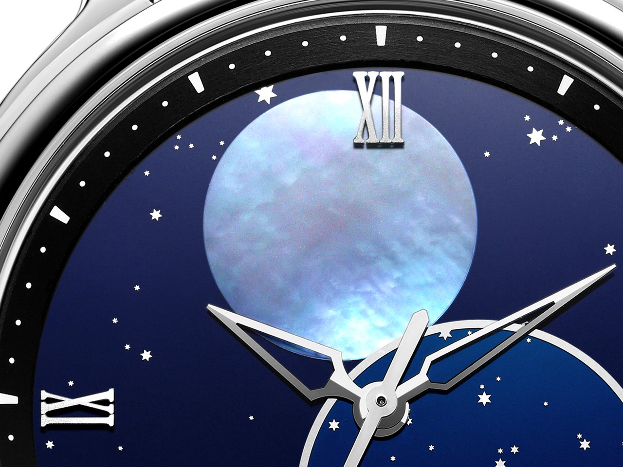 Un quadrante blu madreperla che pare invitarci a tuffarci nel mondo dei sogni chiedendo magari alla luna piena, scintillante nella sua madreperla, di realizzare un nostro desiderio.