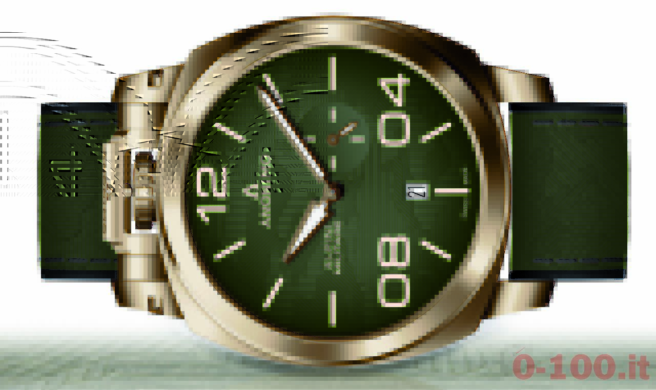 Il quadrante, volutamente essenziale, sfoggia un motivo mimetico tono su tono color verde kaki o bronzo con numeri, lancette e indici bianchi a contrasto per un’ottimale leggibilità.