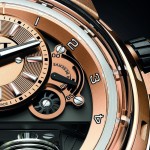 I minuti si leggono a ore 12 in un quadrante trattato in oro rosa mentre i secondi scorrono su di una ruota a forma di girante visibile tra le 9 e le 10. L’indicatore di riserva di carica si può osservare tra le 2 e le 3.
