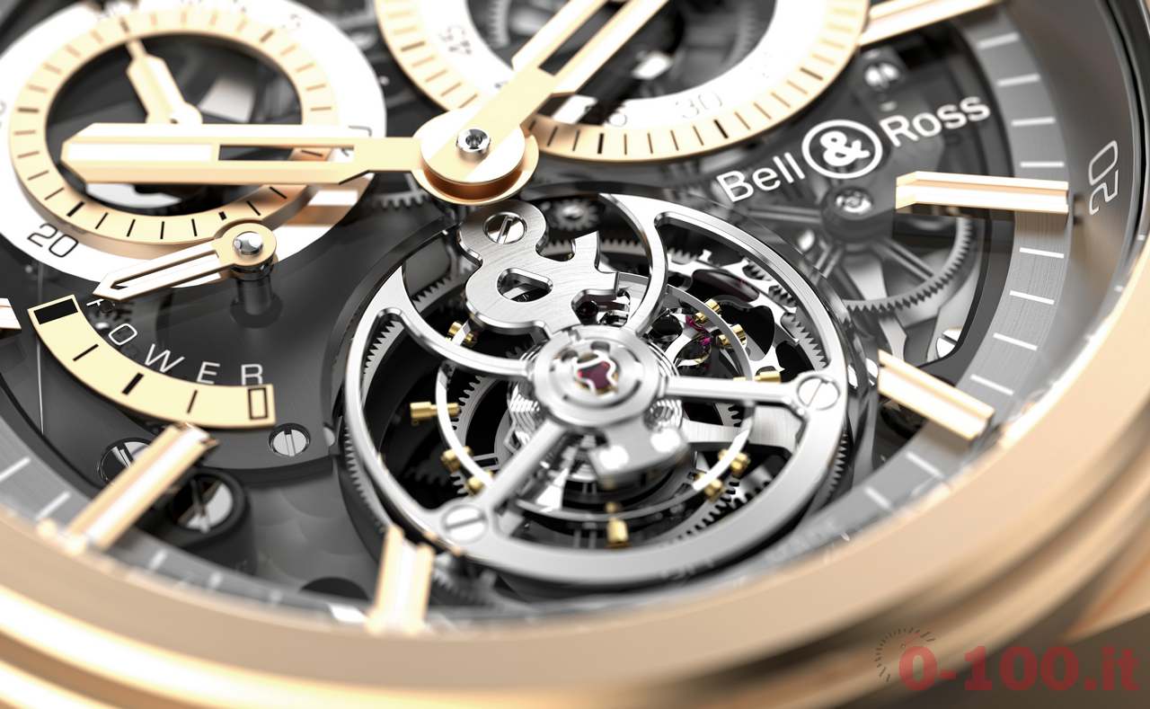Il Bell & Ross BR-X1 Chronograph Tourbillon Limited Edition è un cronografo tourbillon scheletrato con monopulsante a bascula (a ore 2). Offre la visualizzazione di ore e minuti al centro, contatore dei 30 minuti crono con lancetta saltante semi-istantanea alle 10, dei 60 secondi con lancetta trainata a sei impulsi al secondo alle 2, tourbillon volante alle 6 con l’emblema del marchio (&) che scandisce i secondi sulla gabbia in rutenio e indicatore della riserva di carica di 4 giorni (100 ore) visibile tra le 8 e le 9.