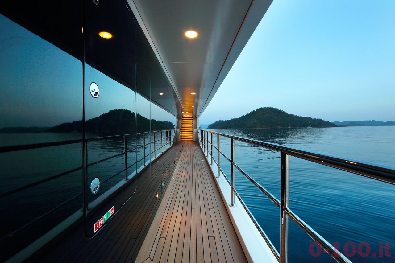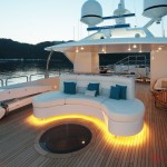 Il ponte aperto a poppa è molto esteso, quello a prora della timoneria è anch’esso alquanto spazioso e ospita, oltre a un grande e confortevole divano, due prendisole a ridosso della Jacuzzi. Una seconda vasca idromassaggio è prevista sul ponte sole la cui area relax può essere all’occorrenza trasformata in eliporto.