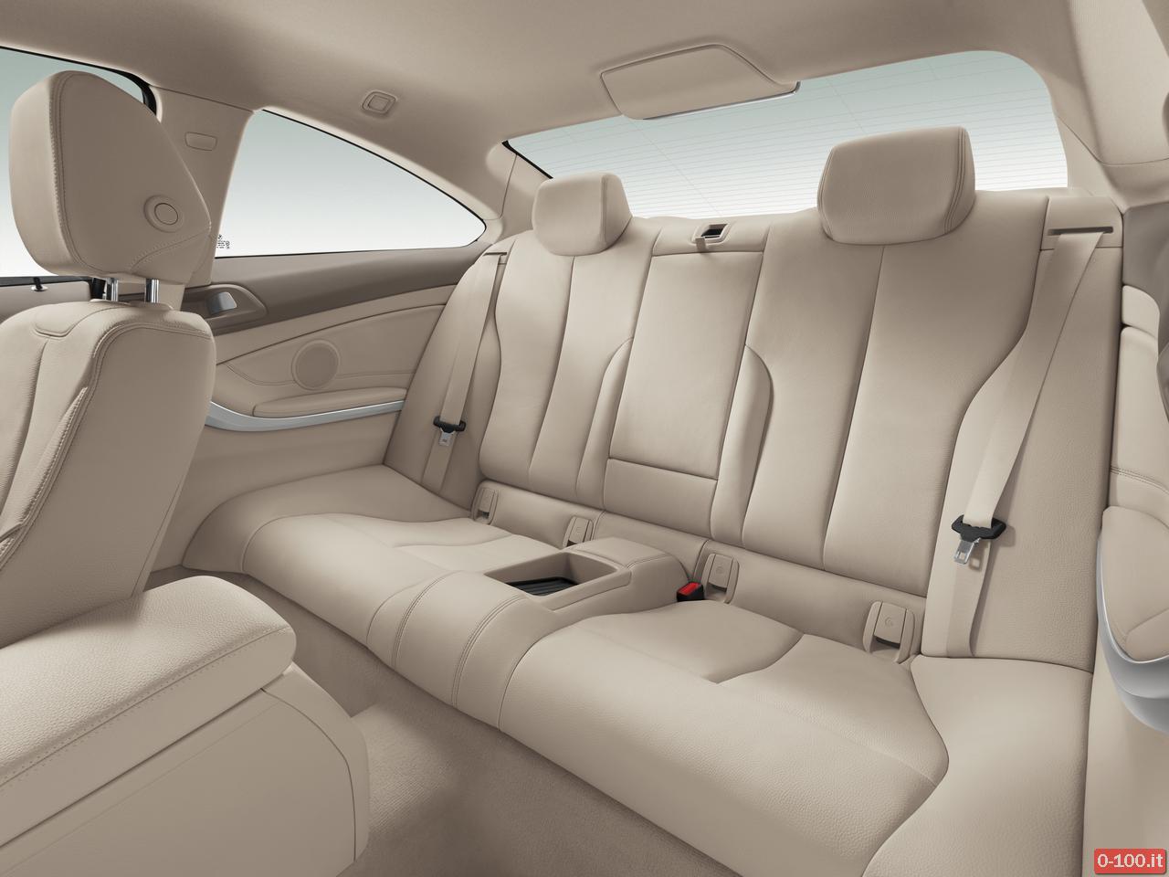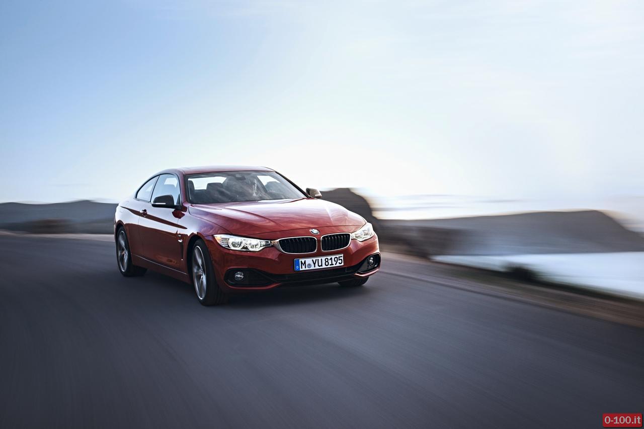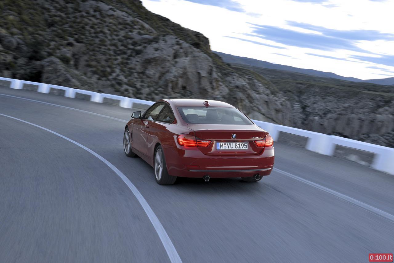 BMW 428i Coupé. Monta un 4 cilindri 2 litri, turbo Twin Scroll, 180 kW/245 CV a 5.000 – 6.500 g/min e una coppia massima di 350 Nm, disponibile tra i 1.250 e i 4.800 g/min. La nuova BMW 428i Coupé accelera sullo 0-100 in 5″9 e raggiunge 250 km/h limitati. Il consumo si attesta su 6,6 – 6,7 litri per 100 chilometri; le emissioni di CO2 sono di 154 – 156 grammi per chilometro (a seconda della misura dei pneumatici selezionata). Con il cambio automatico, il consumo è di 6,3 e 6,4 litri per 100 chilometri e valori di CO2 tra i 147 e i 149 grammi per chilometro.