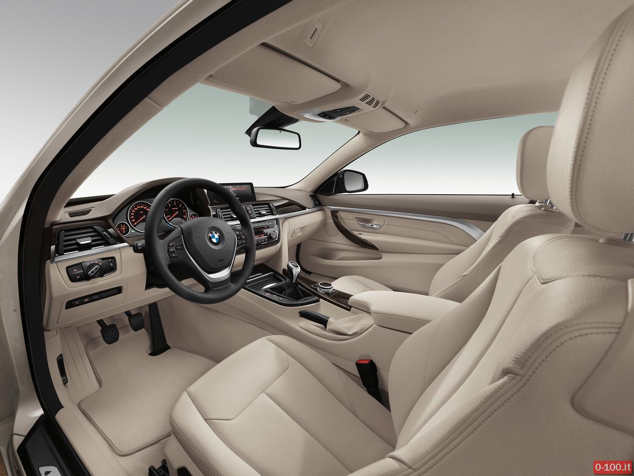 Il cockpit della Serie 4 Coupé è, naturalmente, tipicamente BMW: stile sportivo, orientato al guidatore, massima attenzione all’ergonomia. Tutti i comandi circondano il pilota per consentire il controllo di tutti i sistemi di bordo. Regna un’atmosfera sportiva (il volante a tre razze, la strumentazione racchiusa sotto una grande palpebra, i sedili molto contenitivi con poggiatesta integrati, divanetto posteriore strutturato come due sedili separati) e lussuosa (il porgicintura automatico, il sistema iDrive cn grande schermo al centro della plancia e Touch Controller sul tunnel).