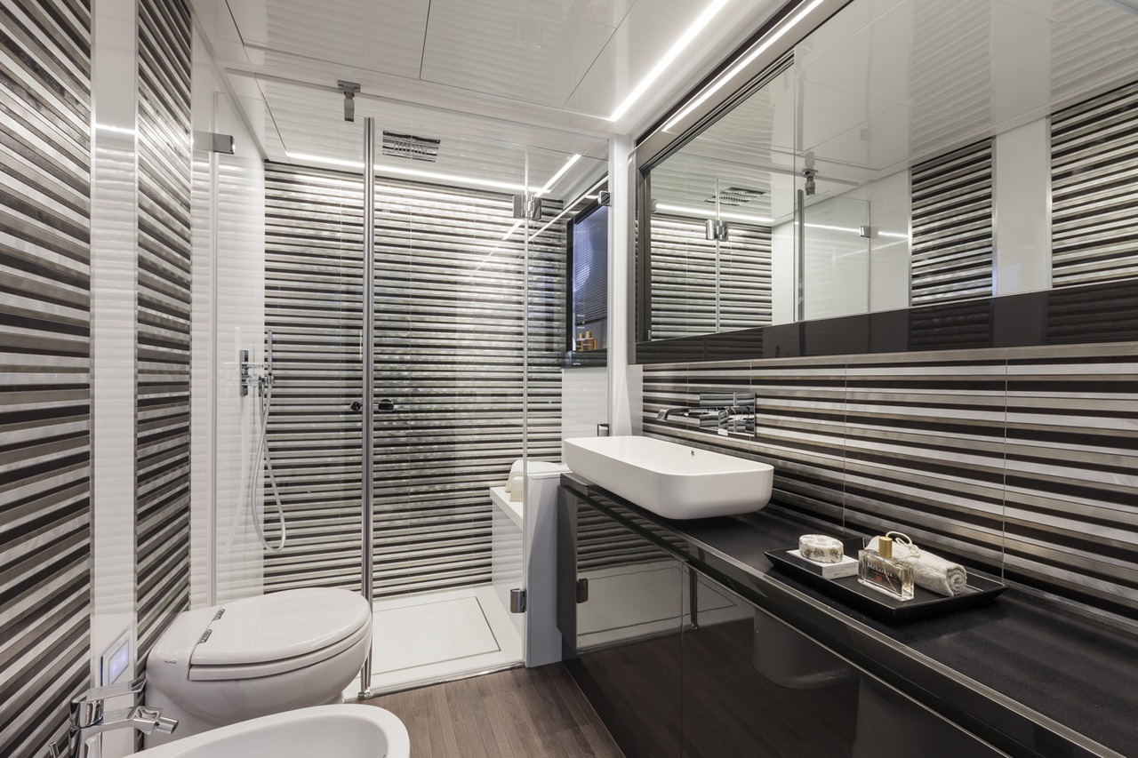 La plancia di comando a dritta, con sedile unico a due posti in pelle Poltrona Frau, è invece fiancheggiata da una seconda zona living con divano a L che, su richiesta, può essere sostituita ed allestita come zona bar.