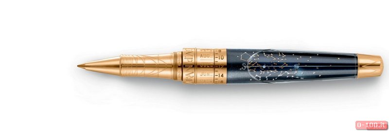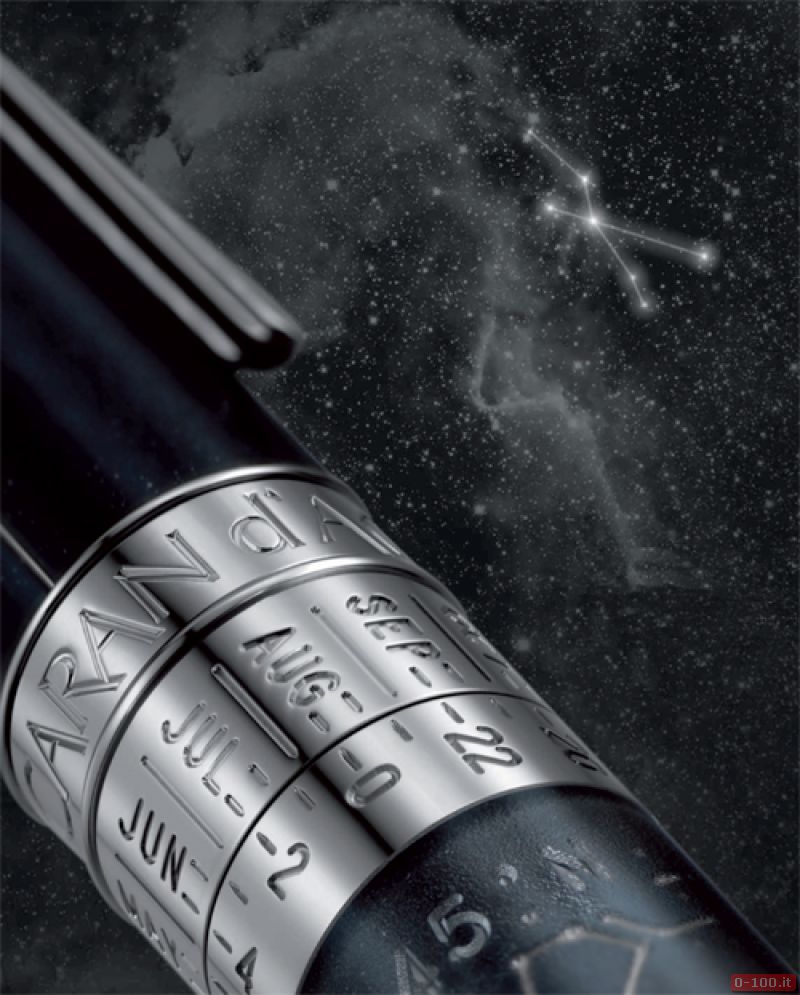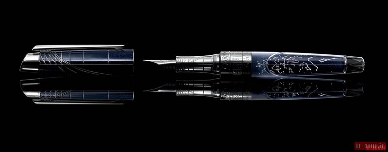Sulla superficie curva della penna i maestri artigiani di Caran d’Ache sono riusciti, grazie a un processo di proiezione innovativo applicato per la prima volta a una penna (strati a lacca di cina blu notte cosparsi di minuscole particelle argentate) a riprodurre la volta celeste con estrema precisione d’incisione.