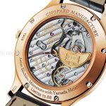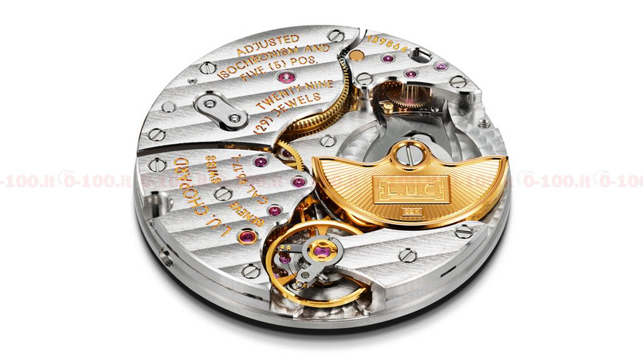 La cassa ultrapiatta di questo orologio (39,5 mm x 6,8 mm) ospita il calibro automatico L.U.C 96.17-L (micro-rotore decentrato, massa oscillante in oro 22kt anglé, incisa e guilloché, ponti decorati a Côte de Genève, due bariletti, riserva di carica di 65 ore). Il movimento si può ammirare tramite il fondello aperto in oro rosa 18kt.