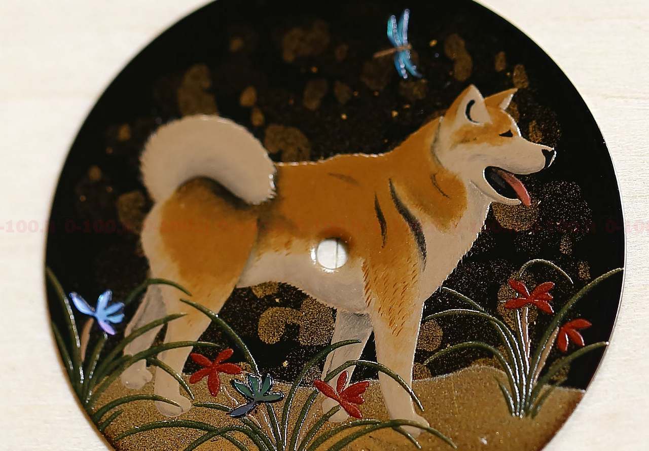 Il Maestro Urushi Minori Koizum, con i suoi gesti antichi e pieni di grazia, ne ha decorato il quadrante rappresentando un Akita, una razza di cane asiatica. A far da sfondo vi sono orchidee selvatiche e una libellula a simboleggiare felici presagi. Il Maestro Urushi, incapsulando minuscole particelle iridescenti, conferisce al quadrante rilievo, luminosità e interessanti sfumature. L’Urushi è un’antica arte giapponese di laccatura. Il nome deriva dall’albero da cui si raccoglie la resina, una volta l’anno e in minime quantità. Da tre a cinque anni dopo il raccolto, la resina è trattata per diventare una lacca particolarmente resistente.