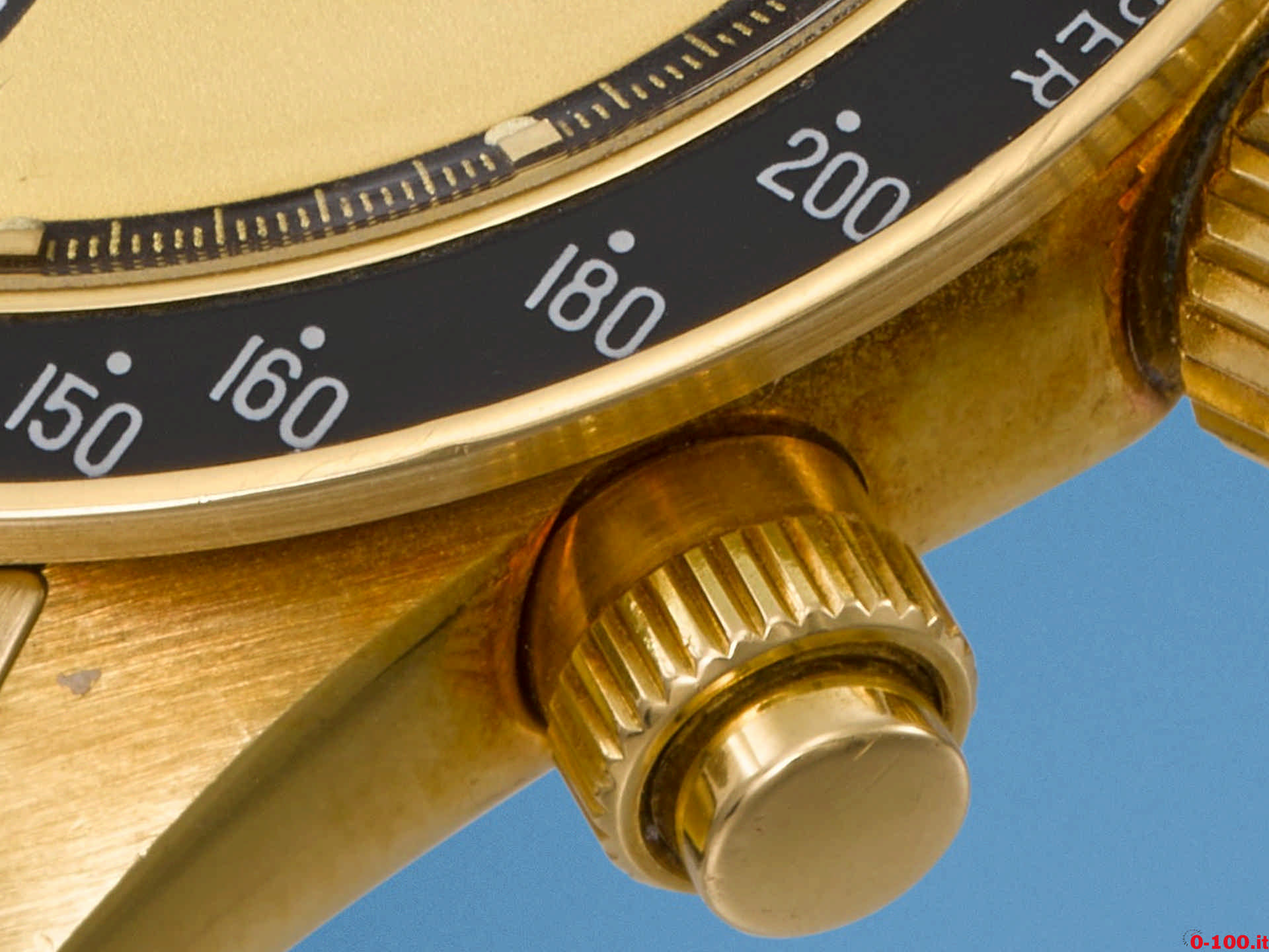 Per molti anni si è pensato che non esistessero Cosmograph Daytonas in oro con pulsanti cronografici a vite e con quadranti “Oyster Lemon Paul Newman”. Questo esemplare del 1969 circa ha fatto scalpore quando è apparso all’asta per la prima volta nel 2013; in effetti, è stato uno dei momenti più significativi per gli studiosi di Rolex e i collezionisti di Daytona. Il numero di serie 2’330’402 lo colloca molto presto nella produzione della referenza 6263, precedendo anche alcuni degli ultimi esemplari delle precedenti referenze 6262 e 6264, in un periodo in cui Rolex stava sperimentando diversi tipi di quadrante.