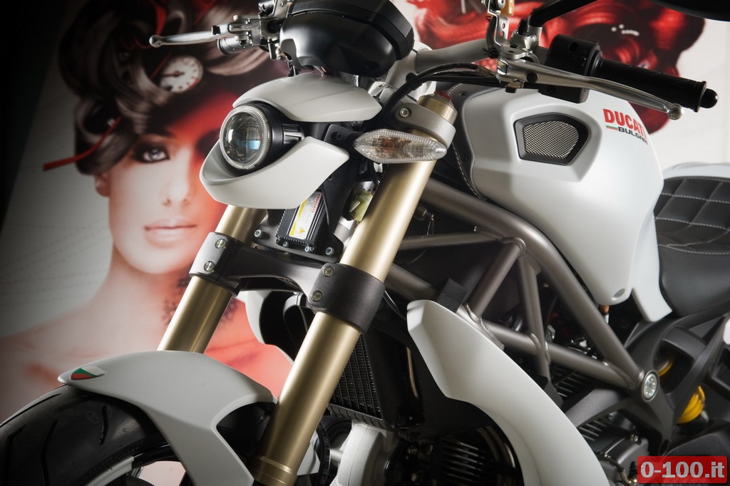 E’ stato modificato anche il design del sedile e del faro anteriore. Posteriormente, la Monster è stata accorciata di 10 cm per aumentare la compattezza. Tutti i dettagli sono verniciati in una nuova tonalità di bianco perlato, differente rispetto alla tinta utilizzata dal marchio di Panigale.