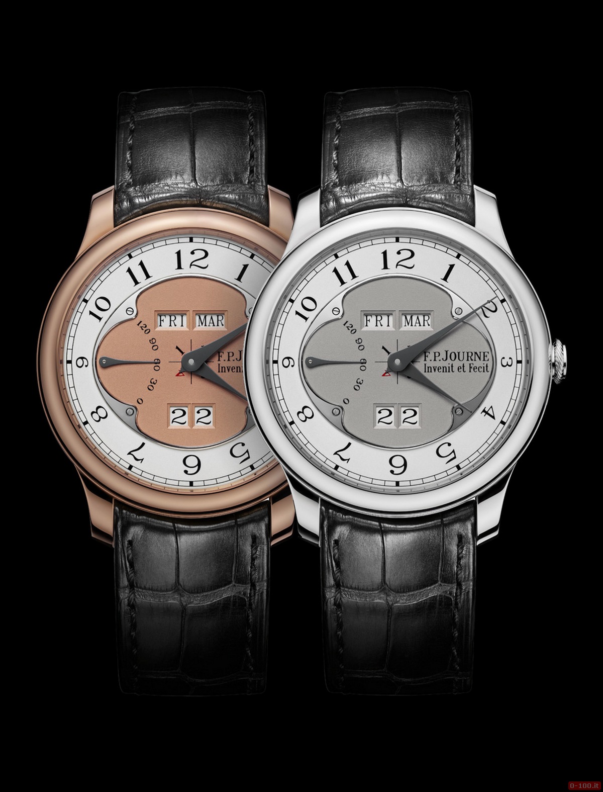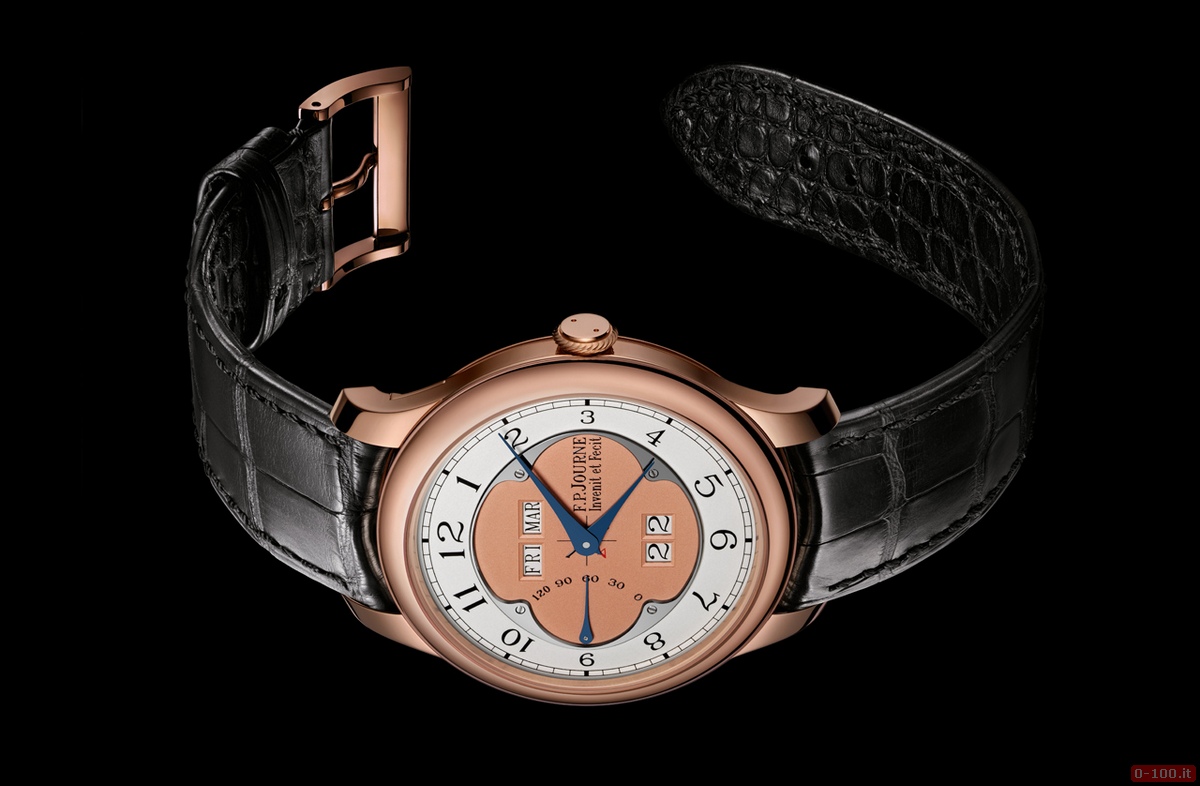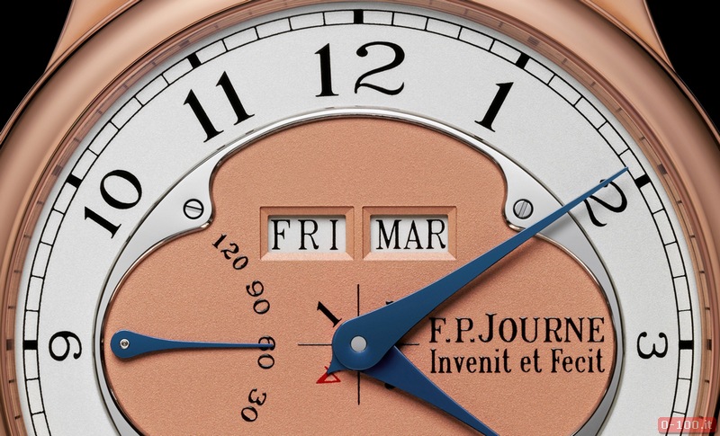 Il quadrante, in oro rosso o bianco 18kt fissato da una cornice in acciaio con un anello d’argento, è pulito e ordinato con grandi aperture: due per il giorno della settimana e del mese a ore 12 e uno per la data di grandi dimensioni in due finestre a ore 6, una specificità di FP Journe. Il salto istantaneo è rinforzato da un ingegnoso sistema di FP Journe progettato per accumulare energia e rilasciarla istantaneamente quando cambia la data, giorno o mese.