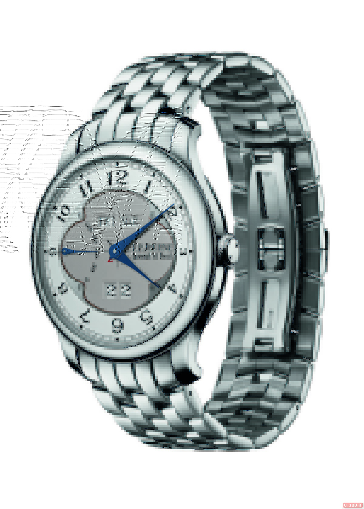 Dotato di doppio cristallo di zaffiro anti riflesso, lato quadrante e lato fondello, ha i numeri romani che diminuiscono progressivamente di dimensione, sia nella parte superiore sia inferiore quando si avvicinano all’asse orizzontale dell’ ovale centrale: più grandi le ore 12 e 6 e più piccole le ore 3 e 9.