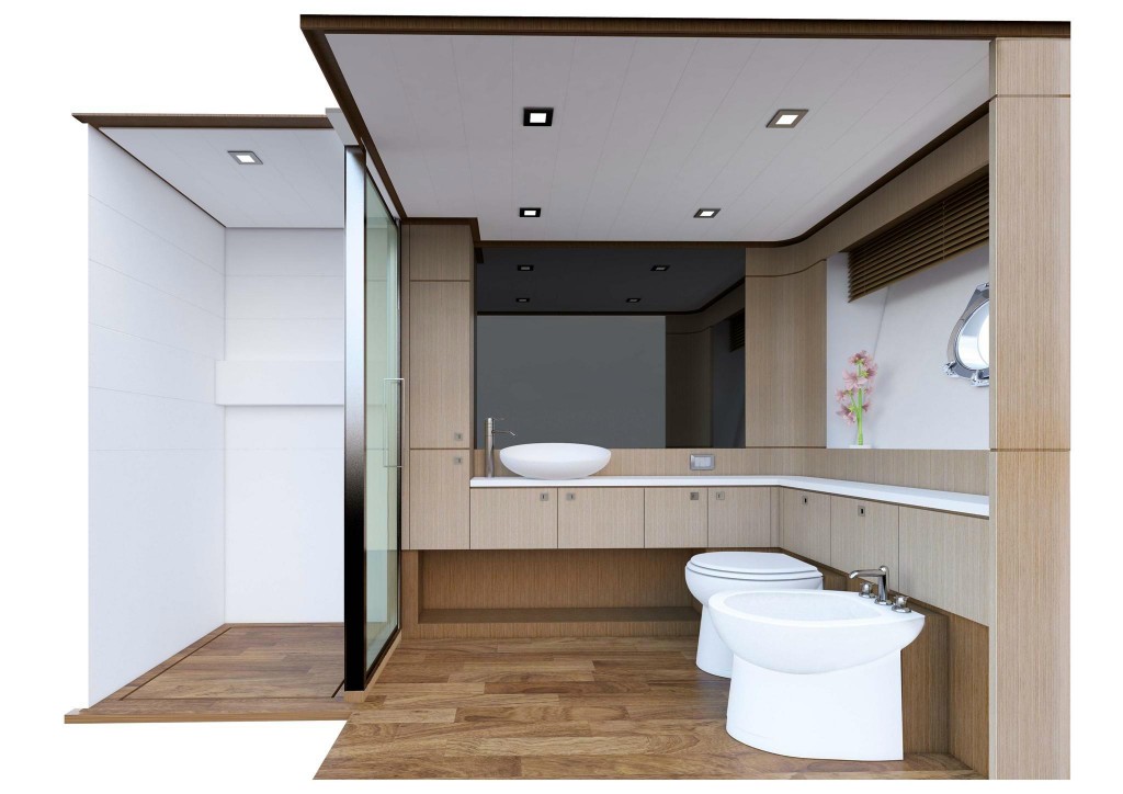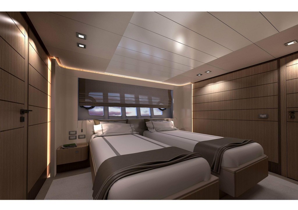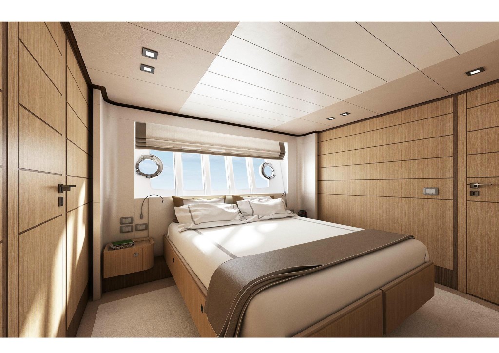 E’ la prima imbarcazione da diporto planante del brand Ferretti con 5 spaziose cabine: 1 per l’armatore a pruavia sul ponte di coperta e 4 per gli ospiti sul ponte inferiore. Sono inoltre previste 3 cabine per l’equipaggio ad accesso riservato dalla cucina.