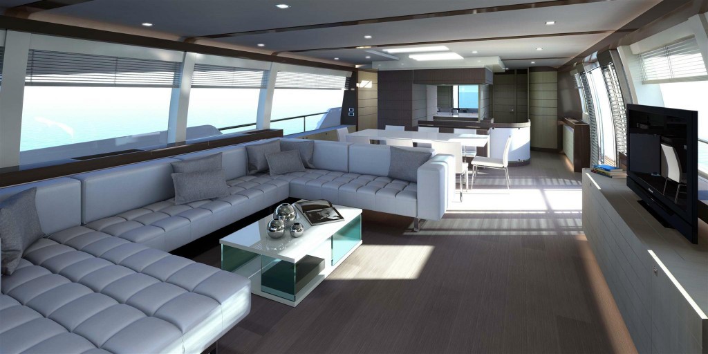 La grande luminosità degli interni è ottenuta dalla superficie vetrata lungo tutto il ponte principale che lo “taglia” da poppa fino a estrema prua contribuendo anche ad alleggerire il profilo complessivo dell’imbarcazione.