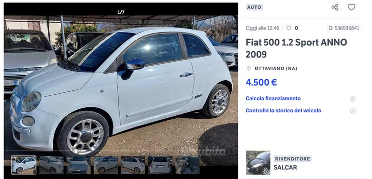 Si tratta dalle Fiat 500 1.2 Sport dell’anno 2009 con cambio manuale, Euro 4, benzina e adatta anche ai neopatentati. La peculiarità è che si tratta di una Fiat 500 1.2 Sport usata e in vendita sul sito web Subito.it. Il venditore assicura che è in buone condizioni meccaniche e mostra nel dettaglio ogni lato della macchina con diverse foto caricate sul sito.