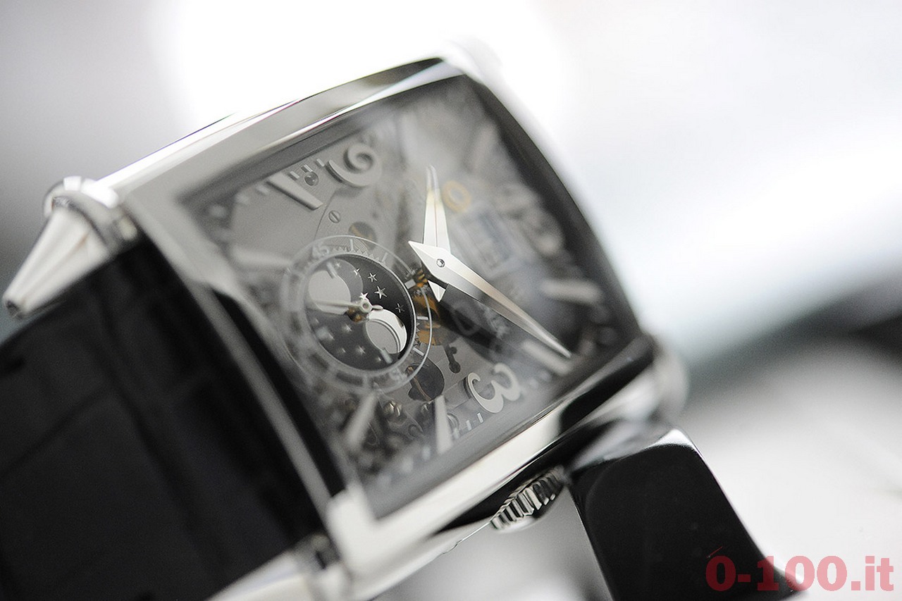 Il meccanismo è alloggiato in una cassa rettangolare (36.10 x 35.25 mm), in acciaio o oro rosa, che mostra un profilo sinuoso e la corona integrata nella cassa.