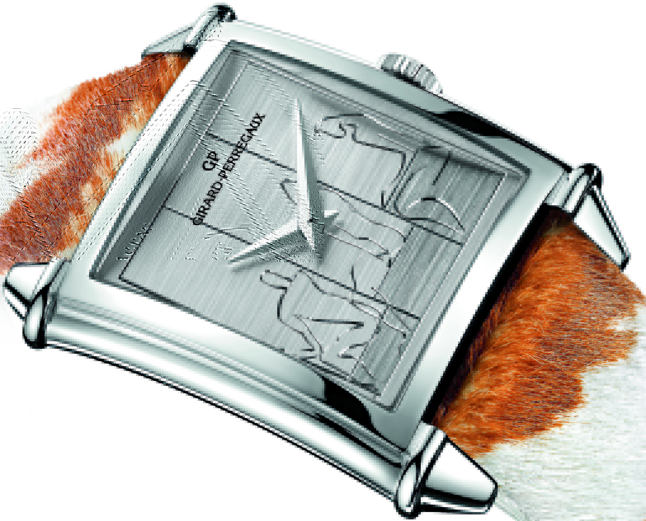 L’associazione di una cassa in metallo e un cinturino in pelle pezzata ricorda la sua famosissima chaise longue.