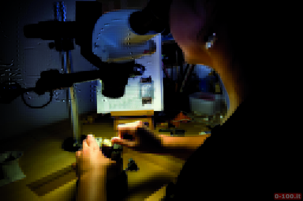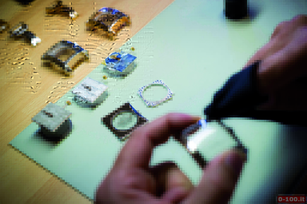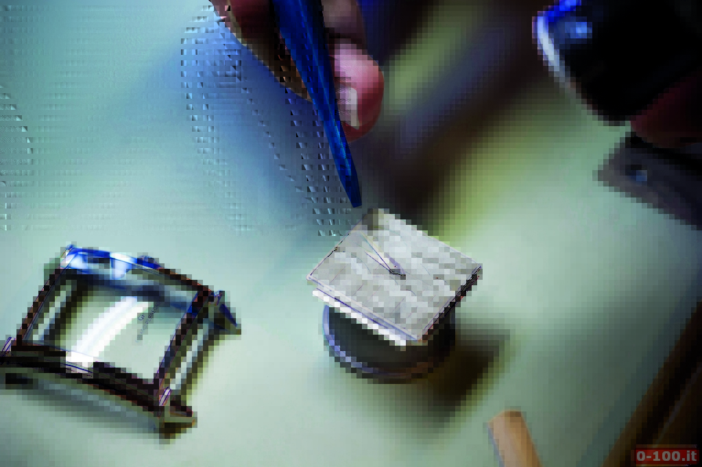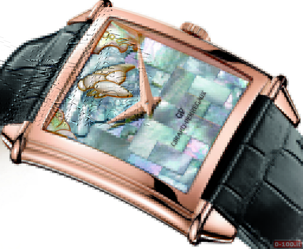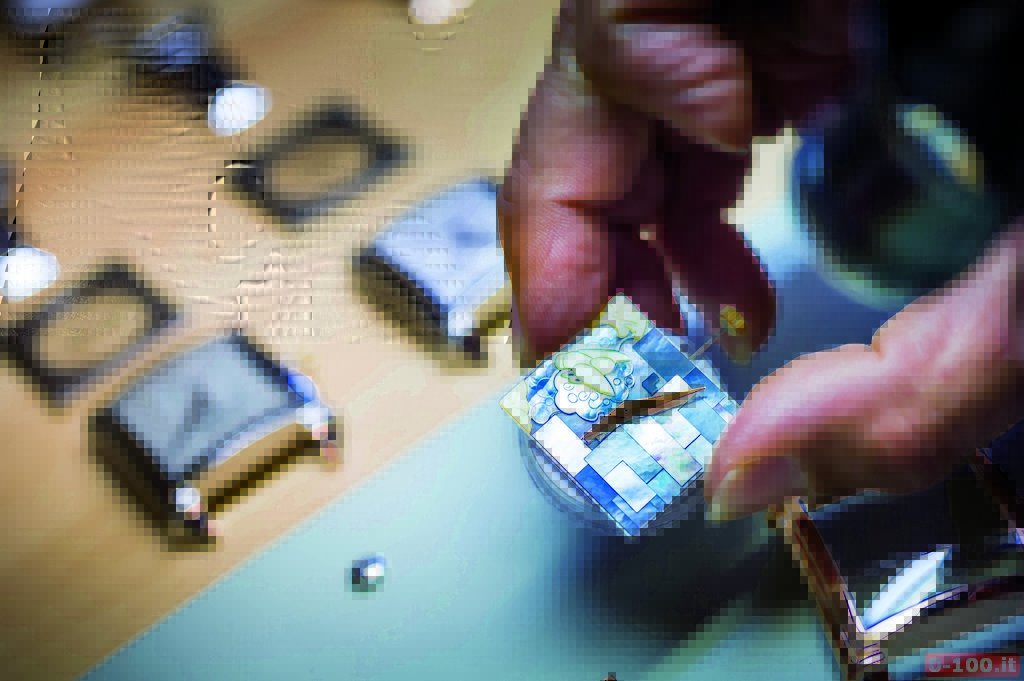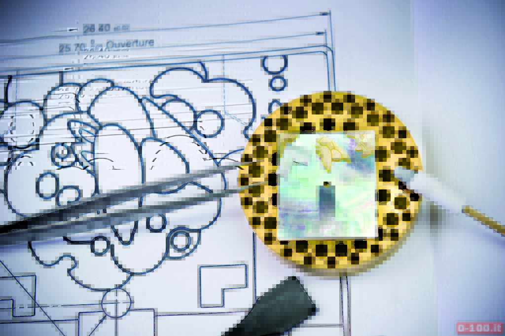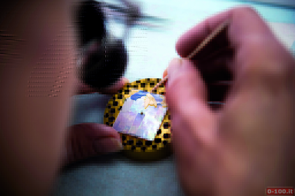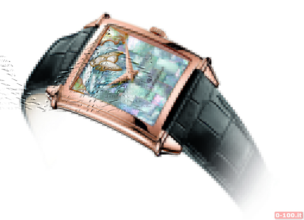 Non si può rimanere indifferenti a questo quadrante in madreperla intarsiato a mano che evoca una delle prime sculture dell’artista. Sette giorni il tempo per realizzare ogni singolo bassorilievo.