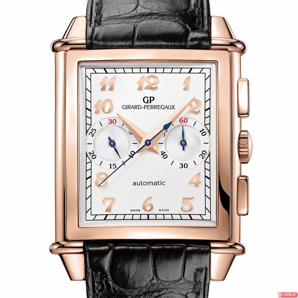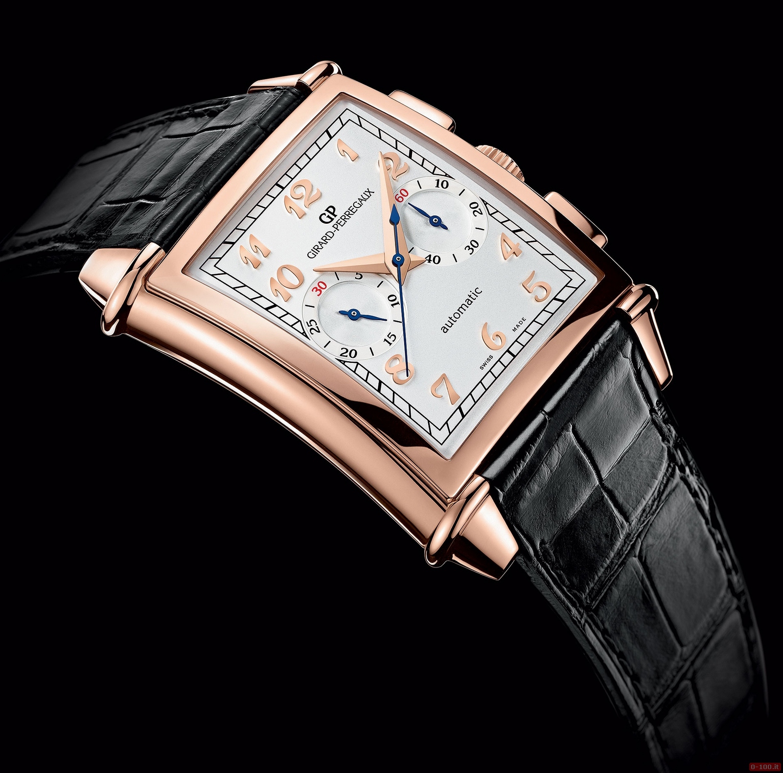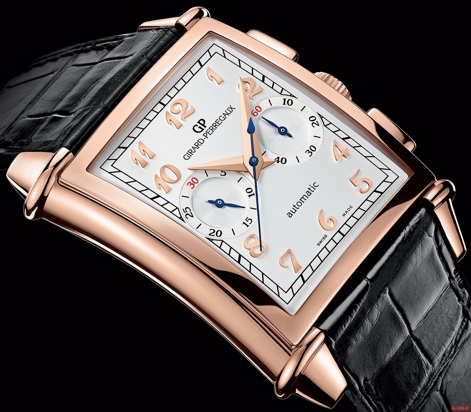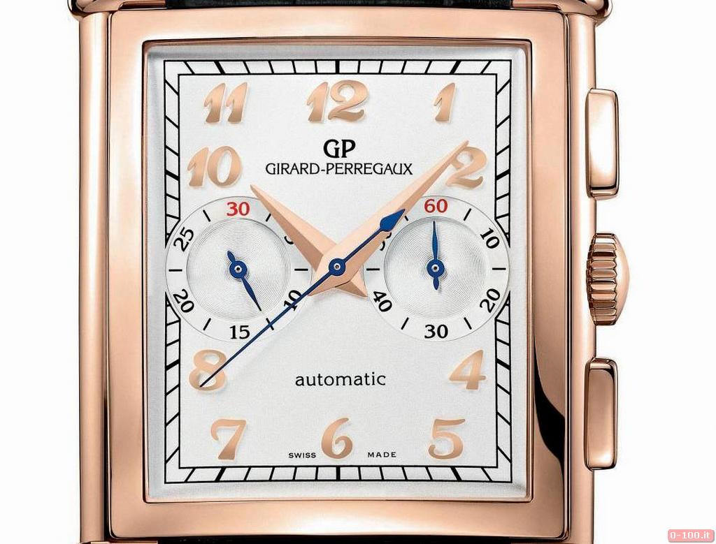 Il Girard-Perregaux Vintage 1945 XXL Chronograph, nelle due versioni in acciaio inox o oro rosa 18 kt, ha la cassa rettangolare dal profilo leggermente arrotondato e misura 36,95 x 36,00 x 12,7 mm di spessore.