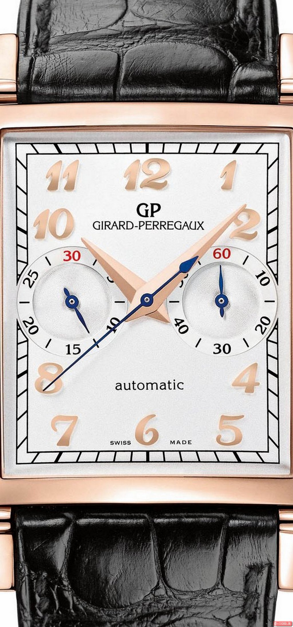 E’ equipaggiato con il calibro GP03300 di manifattura, meccanico a carica automatica dotato di una massa oscillante in oro massiccio (47 rubini, 28.800 alternanze l’ora e 46 ore di riserva di carica).