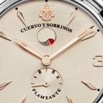 Il Cuervo y Sobrinos Historiador Flameante Reserva de Marcha (Ref.3132.1FA) che prende il nome “Flameante” dalla decorazione guilloché flambé del quadrante in silver come in voga negli Anni 50, è abbinato al calibro ultrapiatto (4 mm di spessore) CYS 2010 su base ETA 7001.