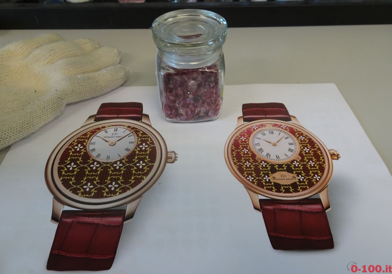 Per realizzare lo smalto Grand Feu, segno distintivo dei segnatempo Jaquet Droz fin dal XVIII secolo, i maestri cadraniers, che impiegano anche un’ora e mezza per realizzare una tonalità di colore (questa operazione, al fine di garantire un eccellente livello di qualità, viene ripetuta ex novo ogni giorno fino al bisogno) giocano con le polveri impalpabili, come borotalco, e le alte temperature del forno grazie alle quali viene assicurata bellezza e resistenza nel tempo.