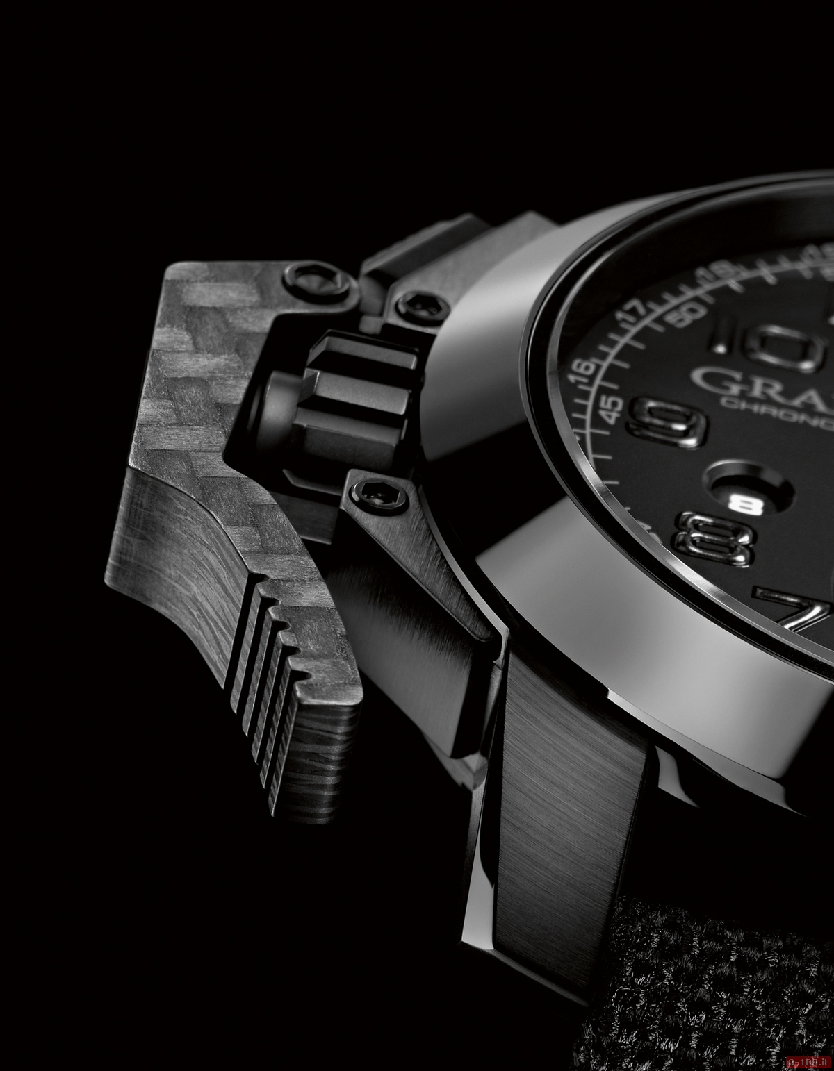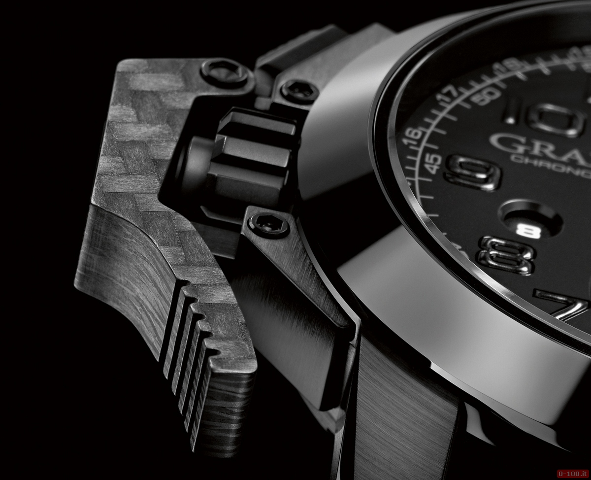 La lunetta è in ceramica nera mentre la classica leva che protegge la corona (e che arresta il cronografo) è realizzata in fibra di carbonio, lo stesso materiale che viene utilizzato per le mazze da hockey della serie NHL.