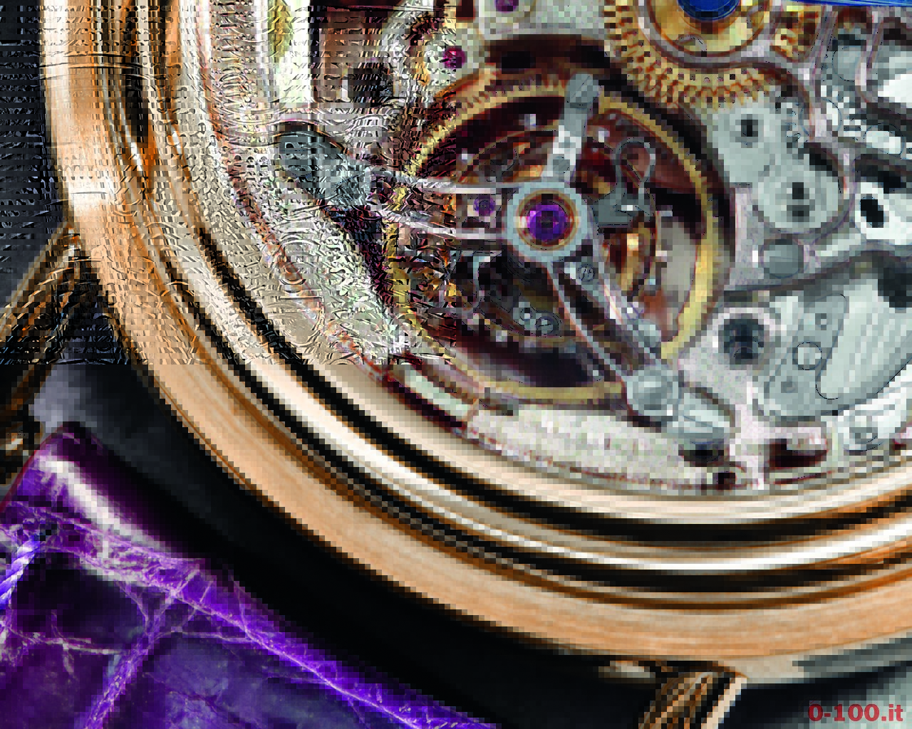 Entrambe le due “facce” dell’orologio sono state smaltate in un sensuale viola e impreziosito con diamanti incastonati lato quadrante (28 diamanti, 0,31 carati). Per l’apertura del copri-cassa superiore basta agire sulla corona zigrinata con meccanismo a pulsante.