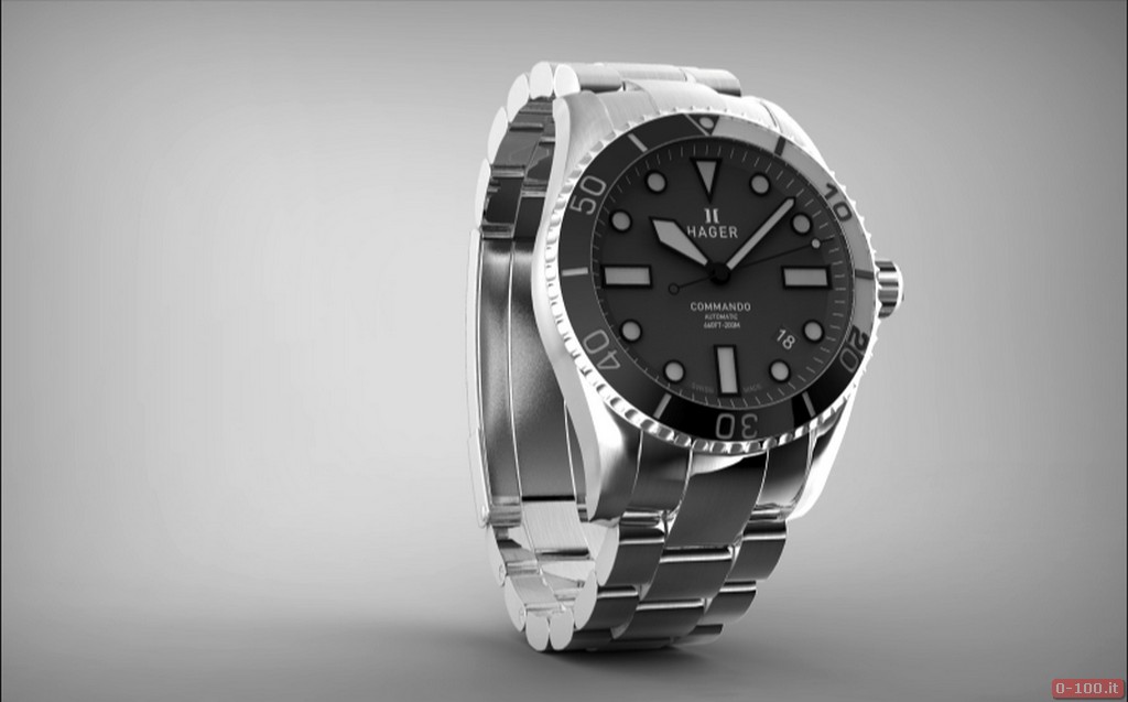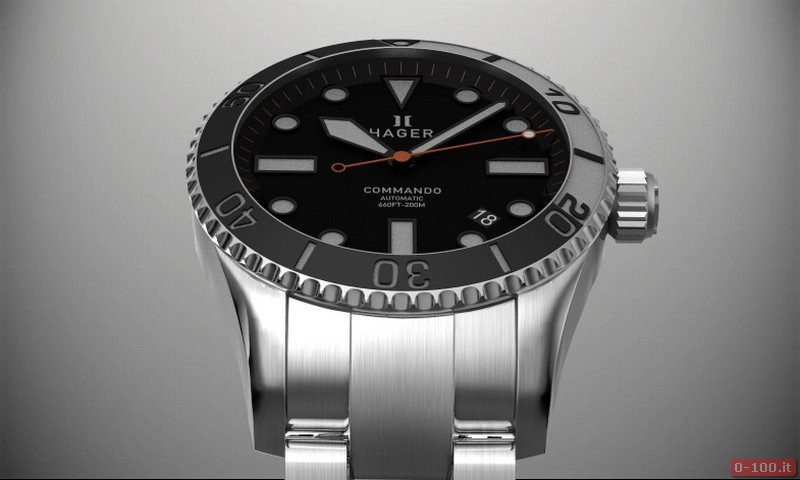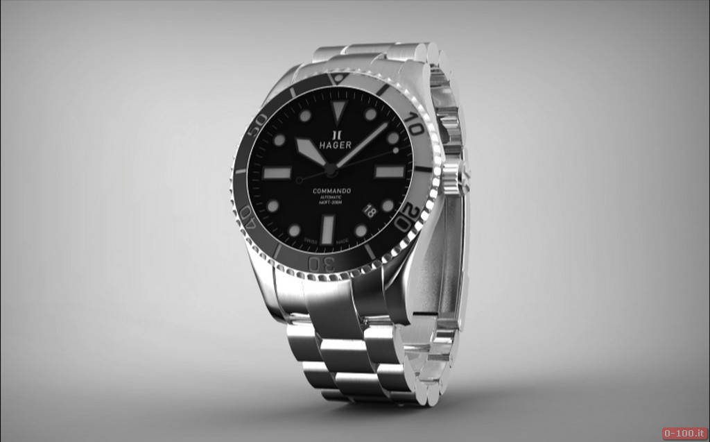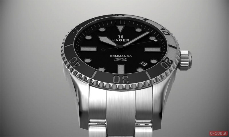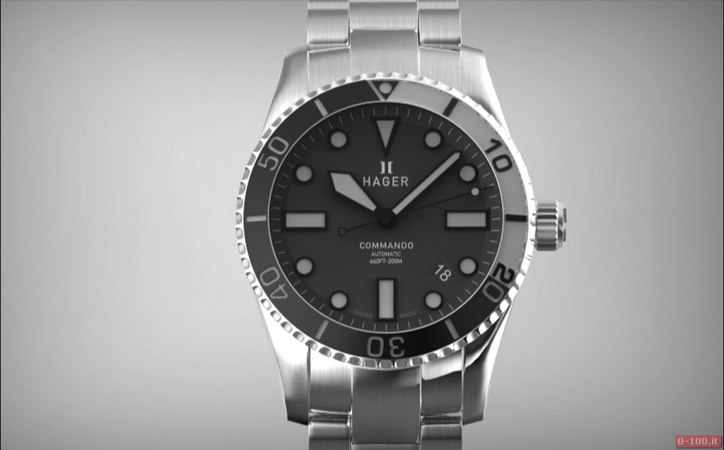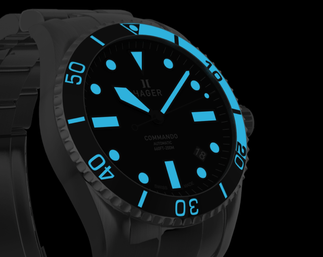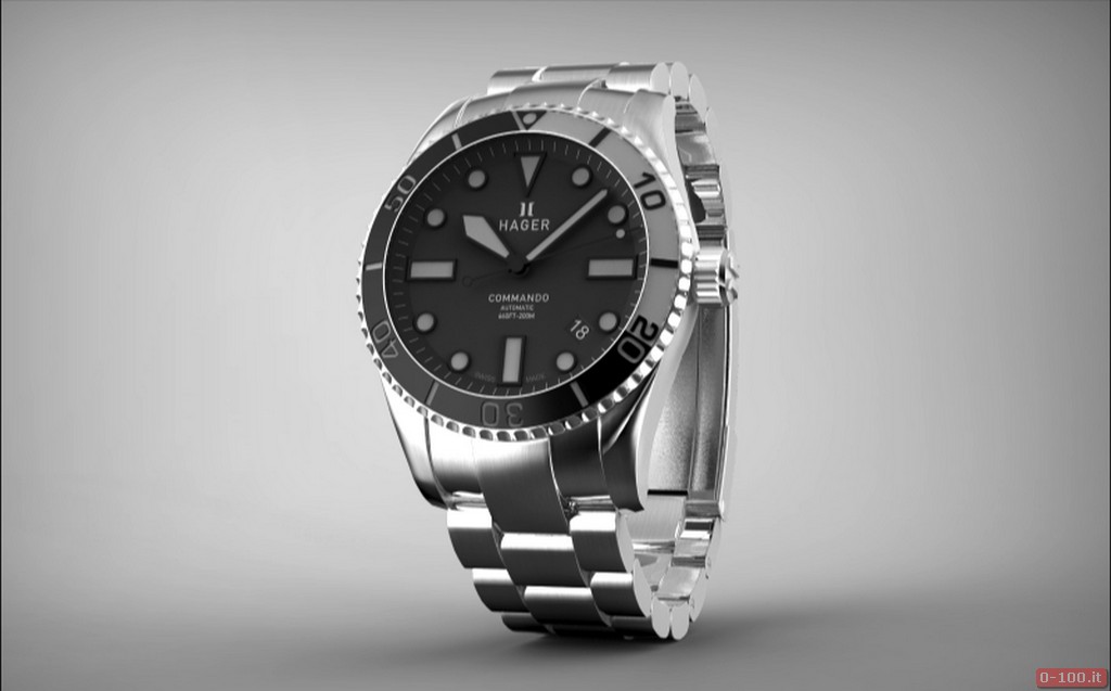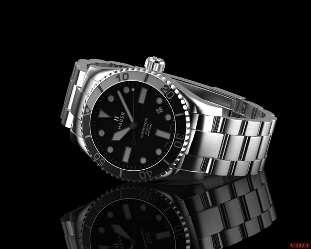 Il Hager Commando Stealth Diver, che misura 42 mm di diametro (corona esclusa) e 14,5 mm di spessore con anse di 22 mm, è realizzato in acciaio inox.