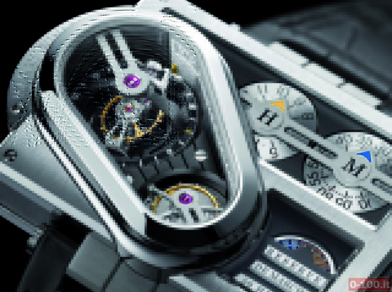 L’indicazione dell’ora avviene attraverso due dischi girevoli, uno per le ore, uno per i minuti. La terza zona del quadrante ospita l’indicazione della riserva di carica su un disco con pavé di zaffiri e citrini.