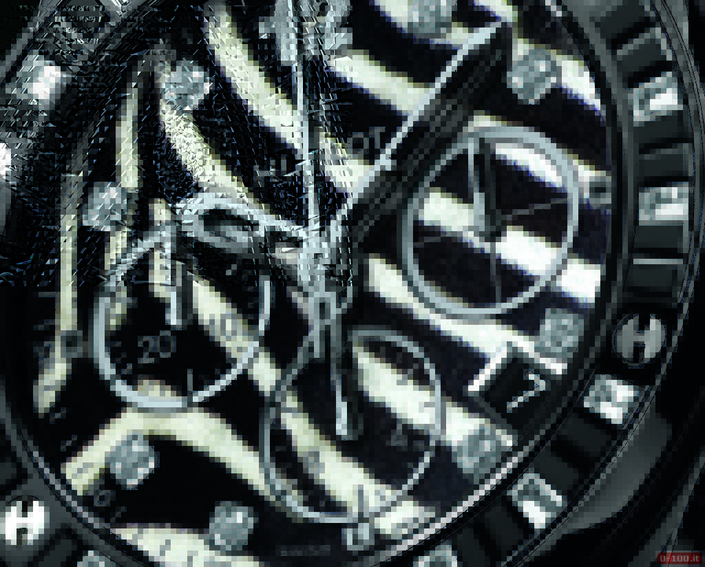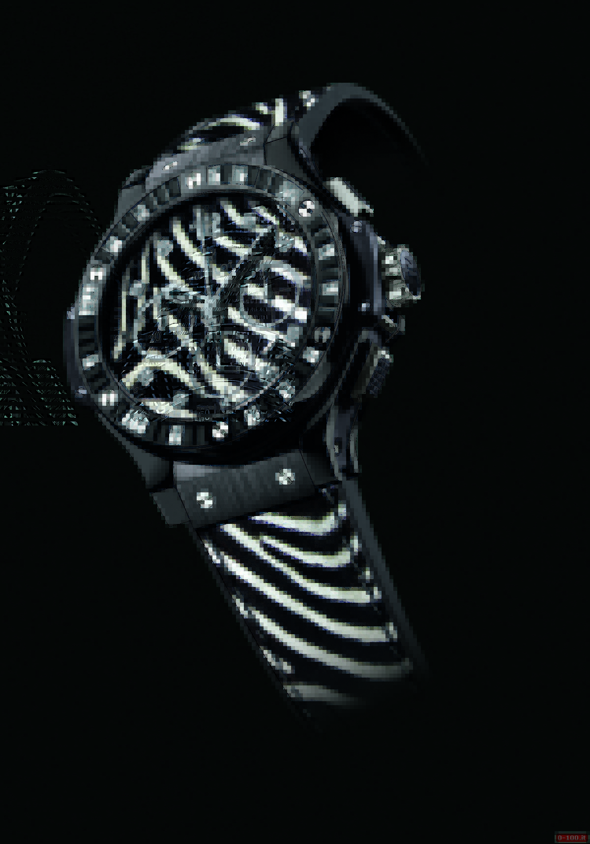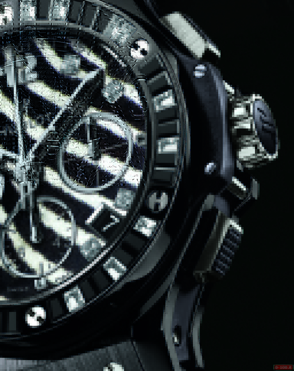 Hublot Big bang “Zebra Bang” monta un movimento meccanico a carica automatica calibro HUB4300, 42 ore circa di riserva di carica, massa oscillante scheletrata con trattamento PVD nero. Dotato di fondello in titanio o in oro rosso 18 carati, è impermeabile fino a 100 metri.
