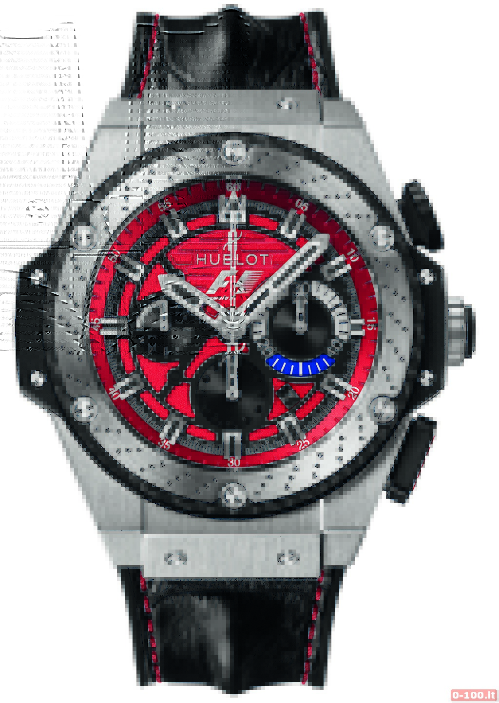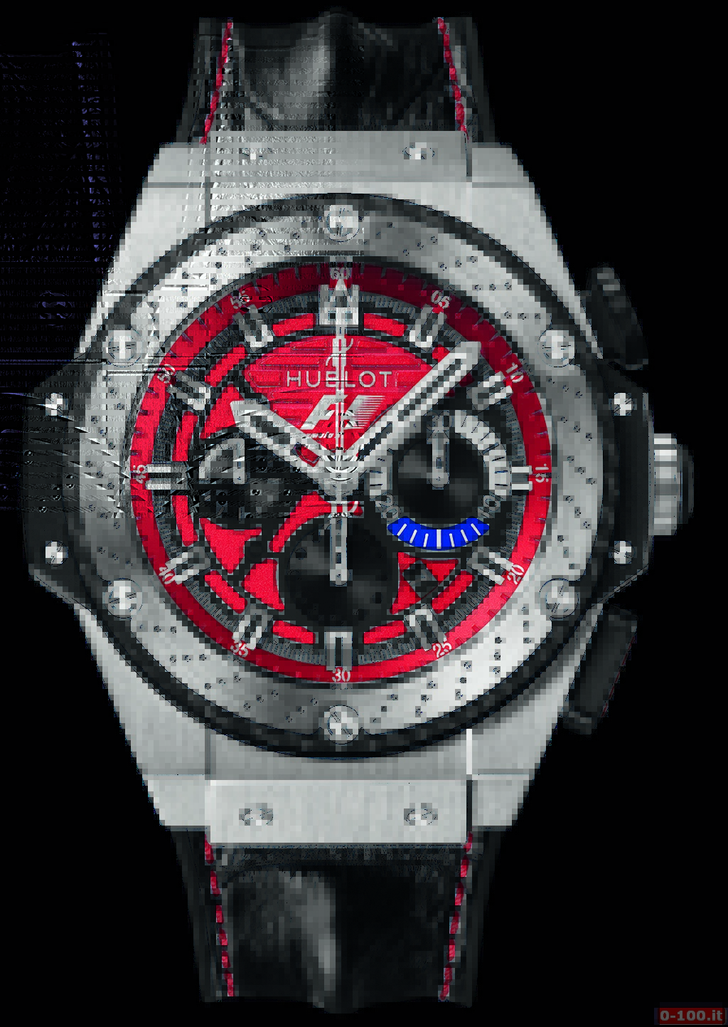 L’Hublot F1™ King Power Austin è dotato di cassa” King Power” in titanio satinato (leggero, resistente alla corrosione e biocompatibile) e caucciù nero e misura 48 millimetri di diametro.