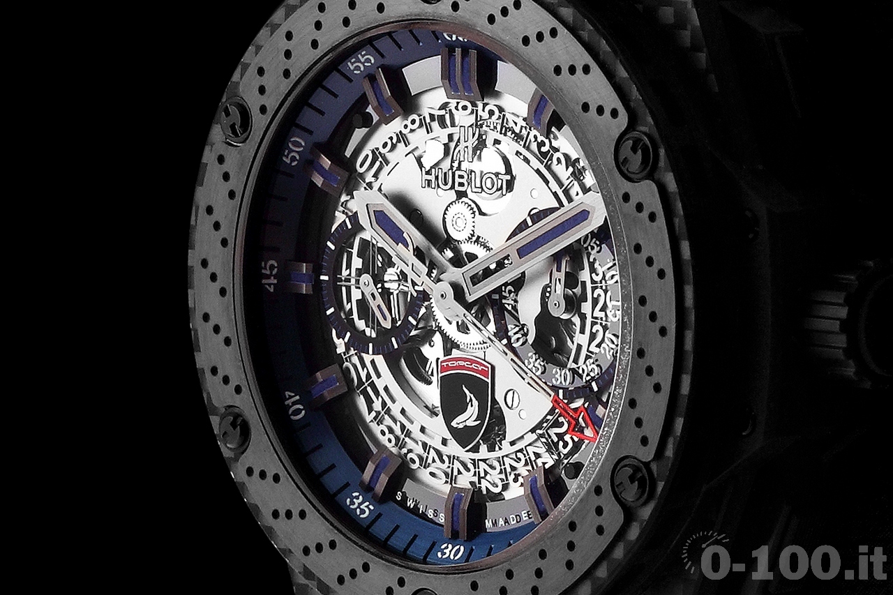 La cassa, che custodisce il meccanismo visibile attraverso il fondello in vetro zaffiro, è realizzata in leggera e resistente fibra di carbonio.
