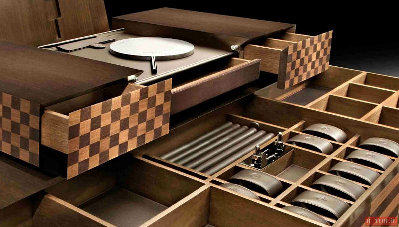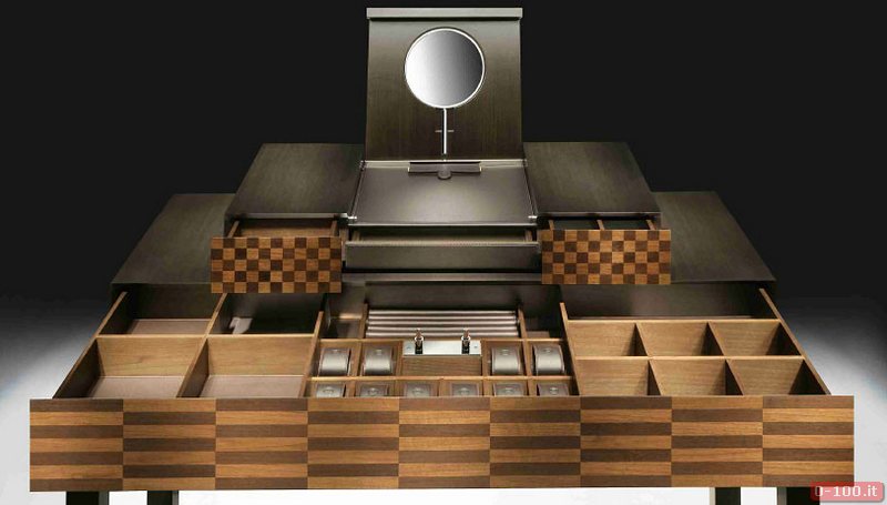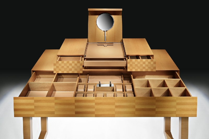 Si compone in cima di due capienti scomparti, di una consolle, di un comparto “segreto” e uno specchio rimovibile. Tutti gli interni sono rivestiti in pelle color marrone scuro o nocciola.