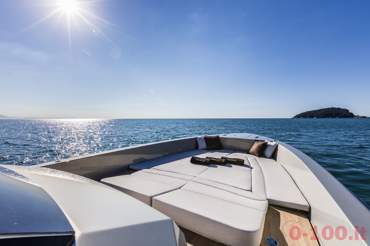 A bordo, gli elementi sono a scomparsa e a filo in modo da non recare nessun tipo di disturbo agli ospiti. A prua, ad esempio, nel teak sul piano di coperta è previsto un tavolo telescopico che sale solo su richiesta. Un bimini-top in carbonio garantisce ombra in caso di bisogno.