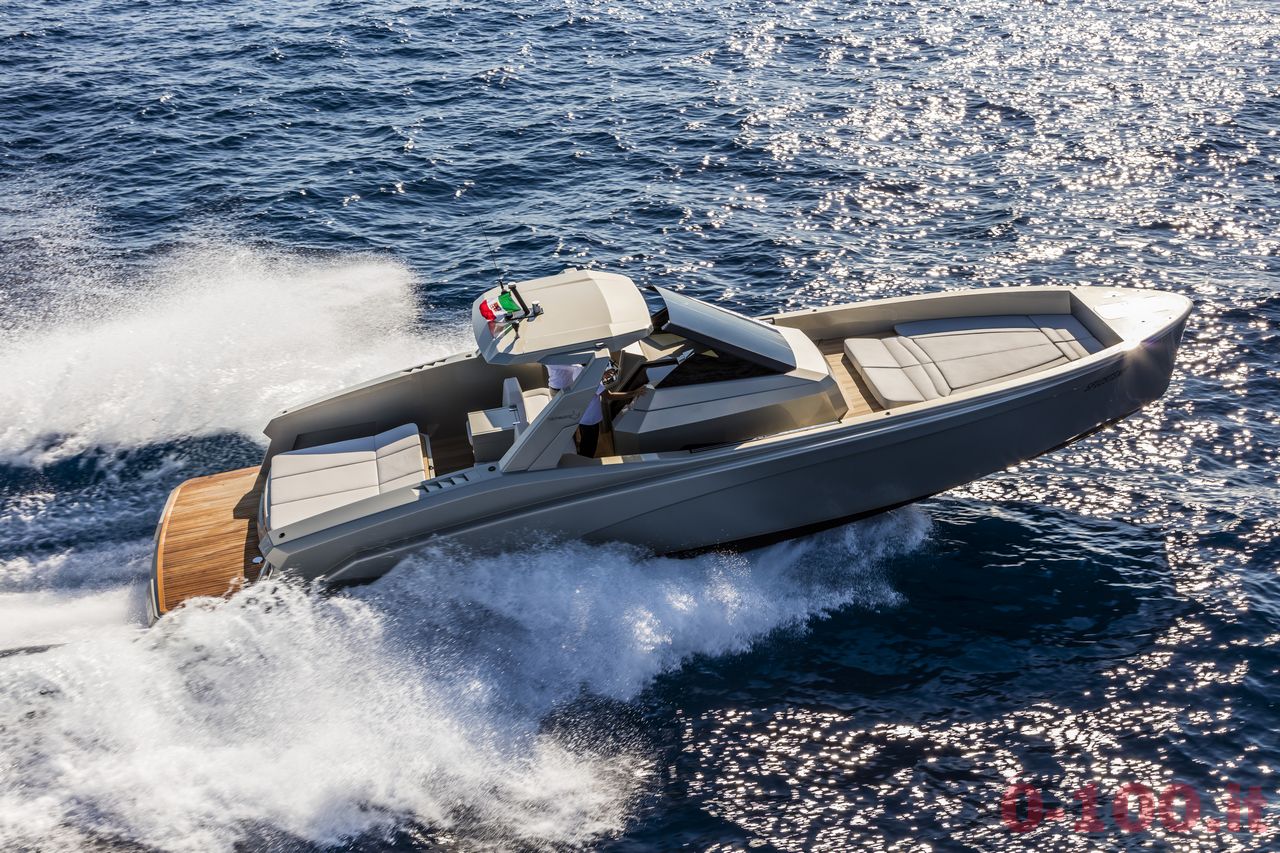 Oltre all’hard-top in alluminio e a un parabrezza “full-crystal”, vi è il cruscotto con plancia high-tech che è costituito da un unico blocco liscio dove l’unica sporgenza è il timone.