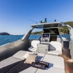 A poppa si può notare un ampio prendisole aggirabile e “ombreggiabile“. La spiaggetta di poppa in teak è provvista di una doccia “altezza-uomo”.