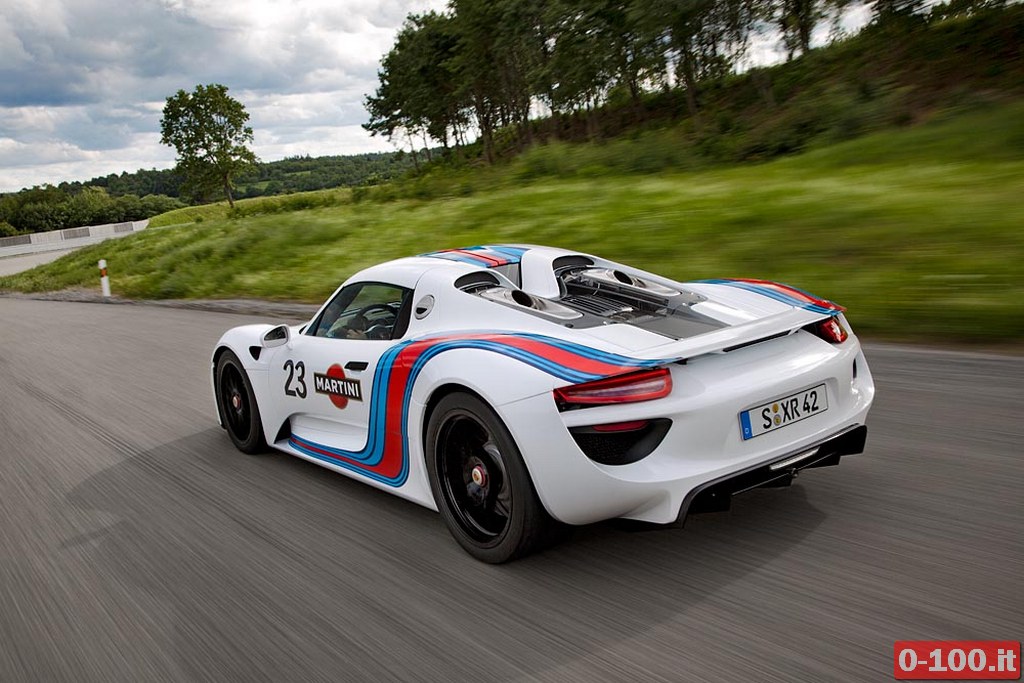 La 918 Spyder, equipaggiata con un 8 cilindri termico abbinato a due motori elettrici (uno per ogni asse) per una potenza complessiva di 770 Cv, è impegnata nei test sul circuito del Nurburgring, dove sta affinando le caratteristiche dinamiche del telaio (monoscocca in CFRP, plastica rinforzata con fibra di carbonio).