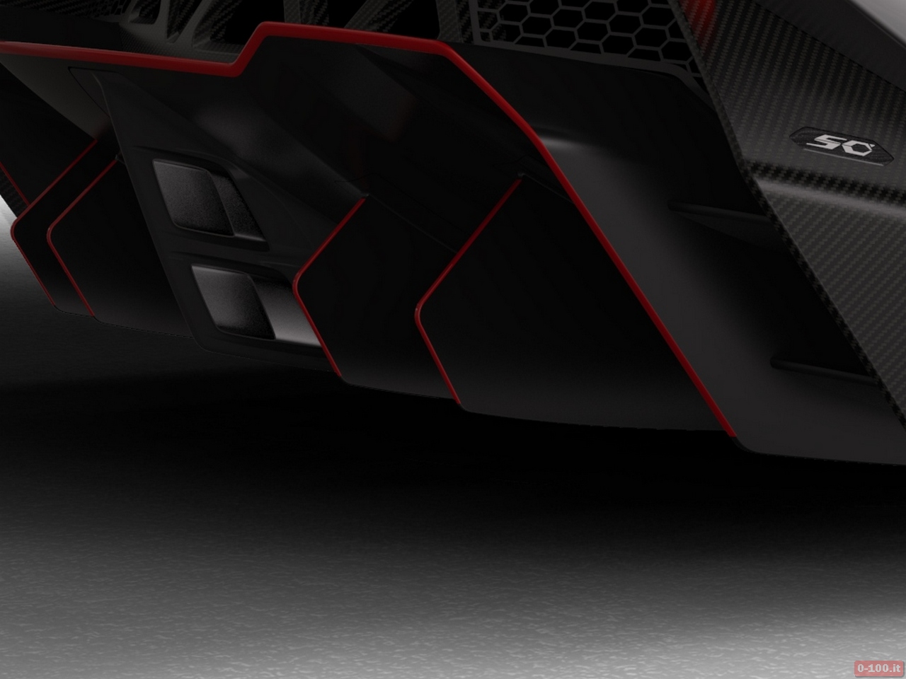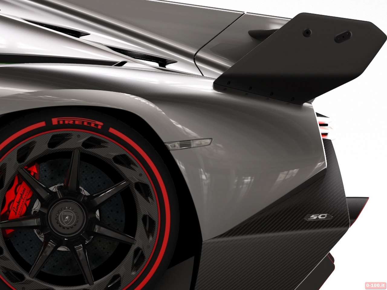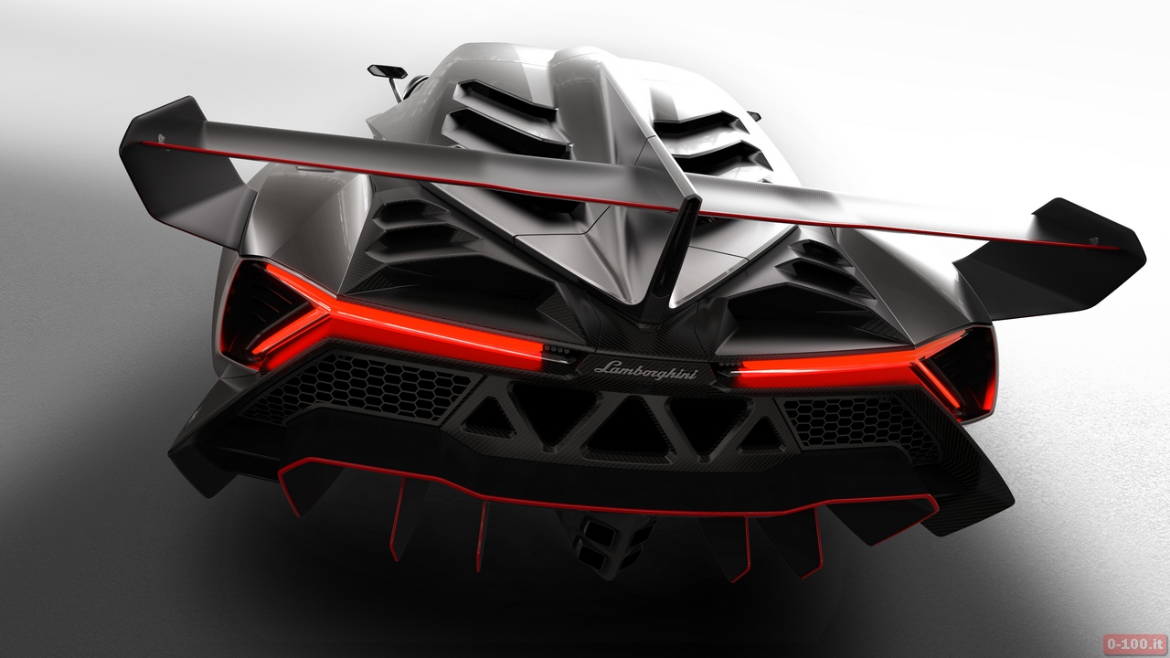 Procedendo verso la coda la Lamborghini Veneno sfoggia un fondo piatto, che in coda diventa un grande estrattore con al centro 4 scarichi. La parte superiore della carrozzeria è dominata da un’enorme ala regolabile con funzione aerodinamica.